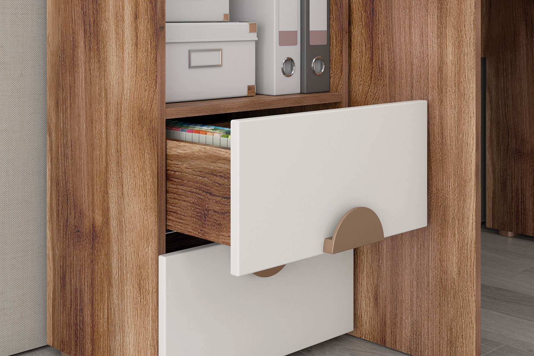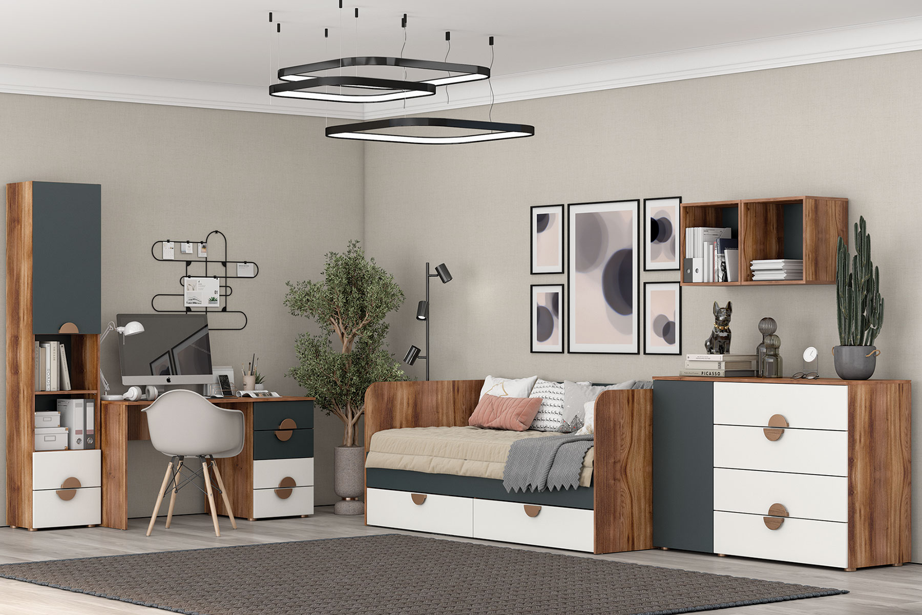 Молодежная система «Тризиль» Корпус модульной системы изготовлен из 16 мм ламинированной древесностружечной плиты цвет – «Дуб Барокко Янтарный» и «Зеленый Камень». Торцевые поверхности корпуса закромлены кромками ПВХ и ABS. Фасады изготовлены из 16 мм ламинированной древесностружечной плиты цвет «Зеленый Камень» и 16 мм МДФ плит, укрытой пленкой ПВХ. Торцевые поверхности ЛДСП фасада закромлены кромкой ABS. Петли четырехшарнирные с системой плавного закрывания. Система Push to Open применена для антресольных шкафов. Ручки пластиковые – цвет медь. Направляющие шариковые скрытого монтажа с системой плавного закрывания. Опоры пластиковые – цвет медь. Матрас в комплект не входит, приобретается отдельно. Основание кровати - Настил.