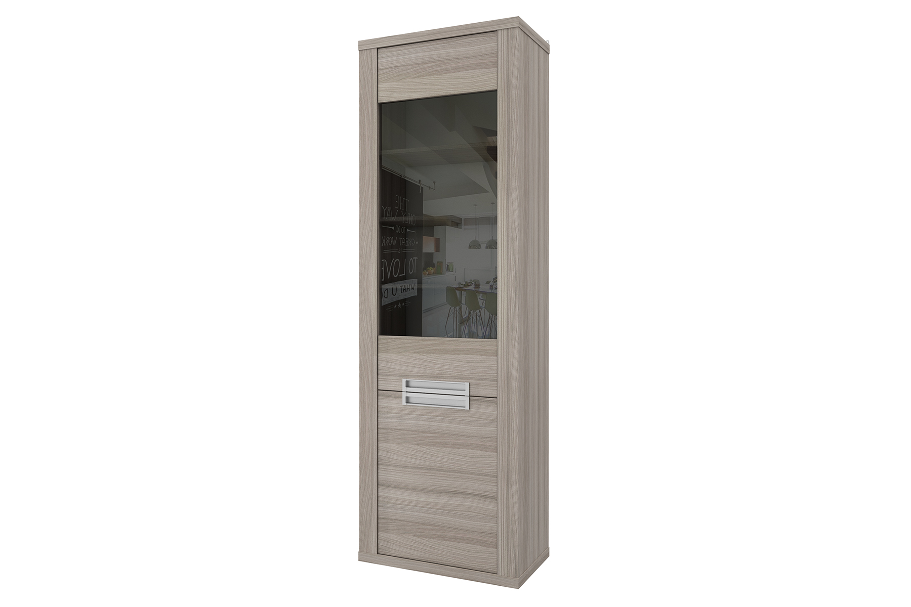 Габариты шкафа — 680 мм в ширину, 2115 мм в высоту и 400 мм в глубину. Такой формат позволяет удобно разместить витрину даже в узком пространстве или между другими модулями. Внутри — открытые полки за стеклом и закрытые секции, что позволяет сочетать демонстрацию и скрытое хранение.