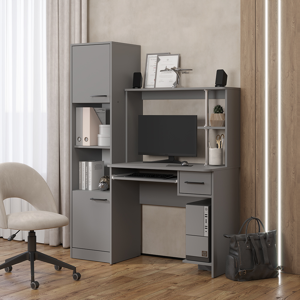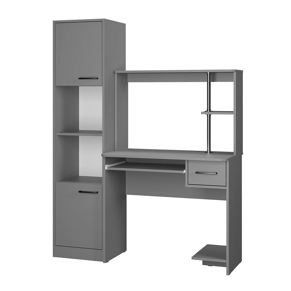 Модель компьютерного стола «Дебют» имеет все необходимые элементы для размещения стационарного компьютера: вместительную столешницу, отделение для процессора и выкатывающуюся полку для клавиатуры. Дополнительно стол оснащен пеналом с дверцей, несколькими открытыми зонами и выдвижным ящиком для хранения необходимых в работе вещей.