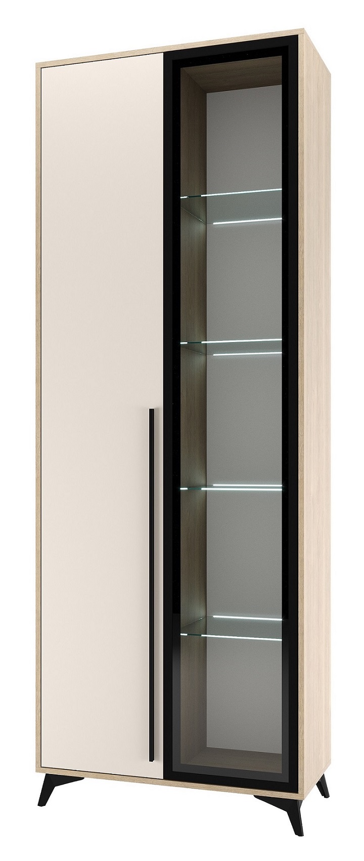 Шкаф-витрина 800 1В1С «ЕВА» с полками и стеклополками. Фасад ЛДСП и лицевой периметр шкафа обработаны кромкой 1 мм. Фасад с графитовым стеклом выполнен в профиле МДФ. Чёрные металлические ручки-рейлинги и ножки-опоры.