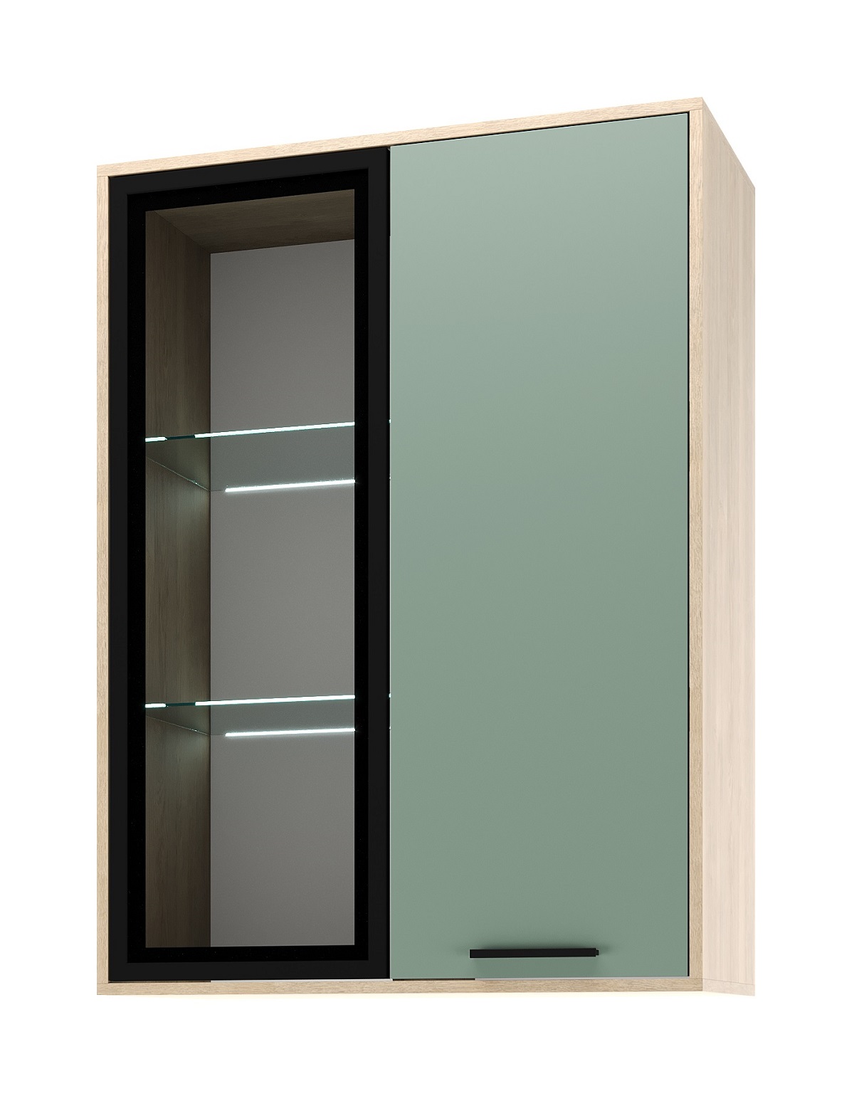 Витрина навесная 800 1В1С «ЕВА» с полками и стеклополками. Фасад ЛДСП и лицевой периметр обработаны кромкой 1 мм. Фасад с графитовым стеклом выполнен в профиле МДФ. Чёрная металлическая ручка-рейлинг.