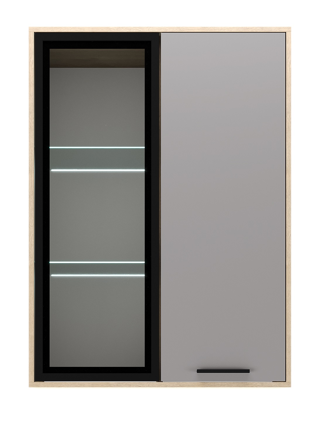 Витрина навесная 800 1В1С «ЕВА» с полками и стеклополками. Фасад ЛДСП и лицевой периметр обработаны кромкой 1 мм. Фасад с графитовым стеклом выполнен в профиле МДФ. Чёрная металлическая ручка-рейлинг.