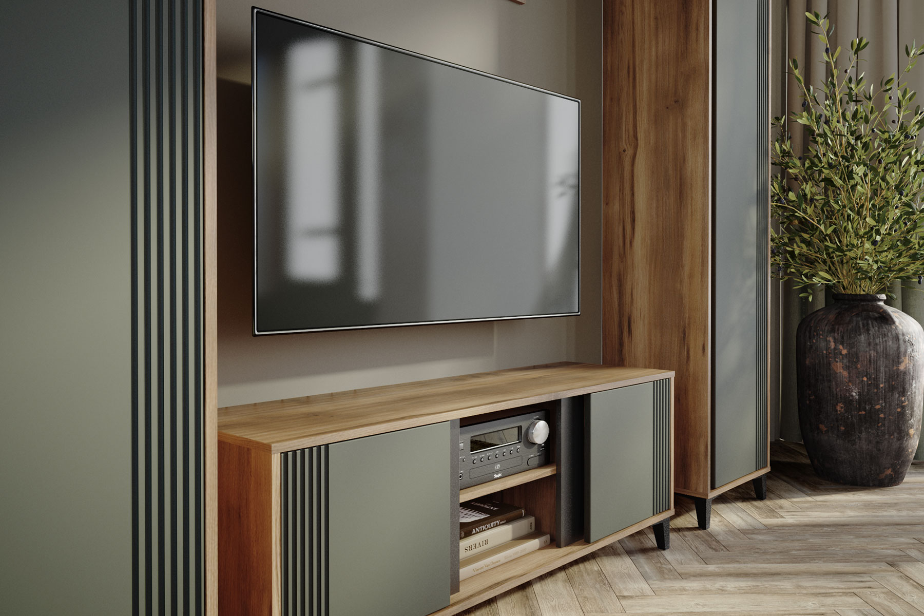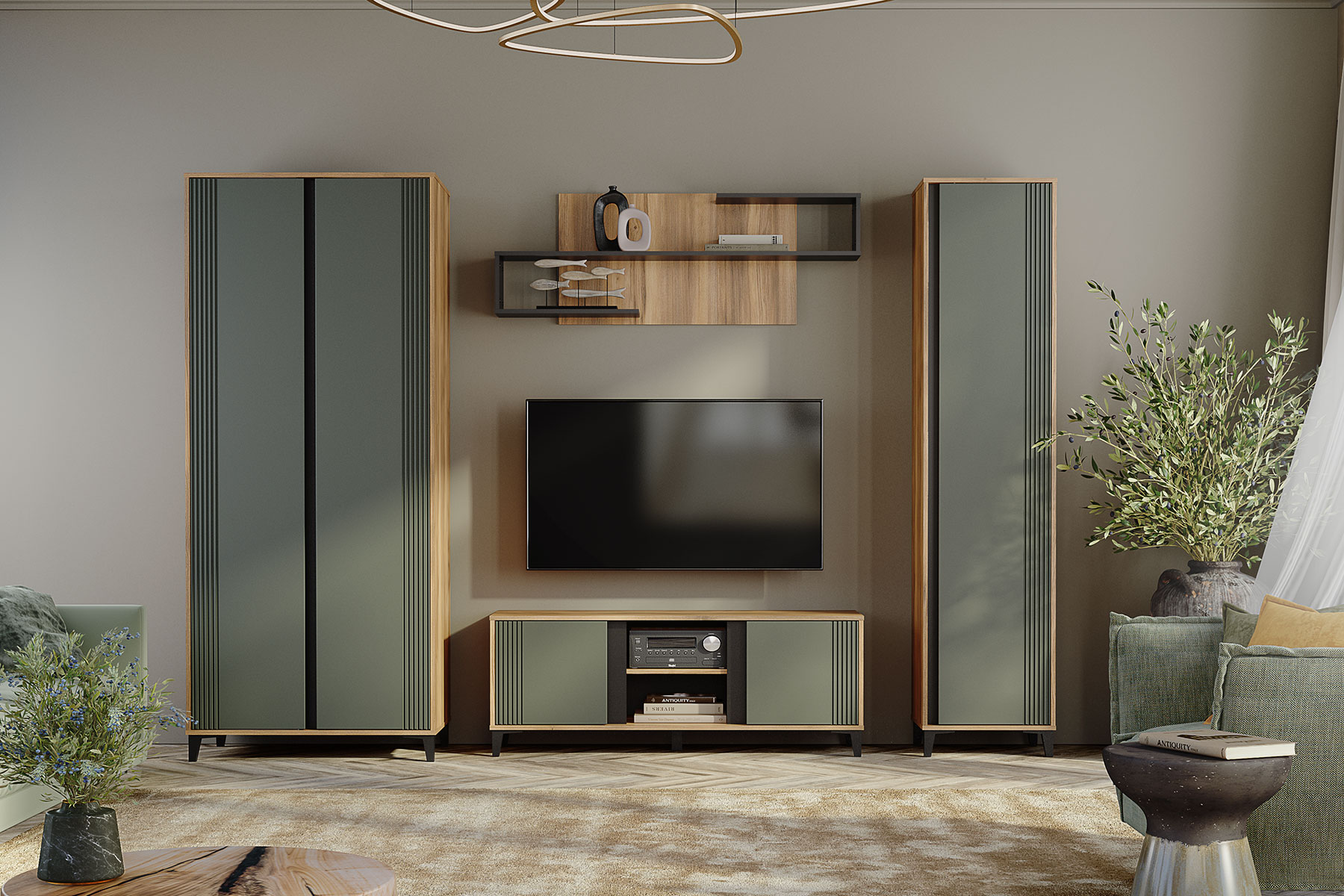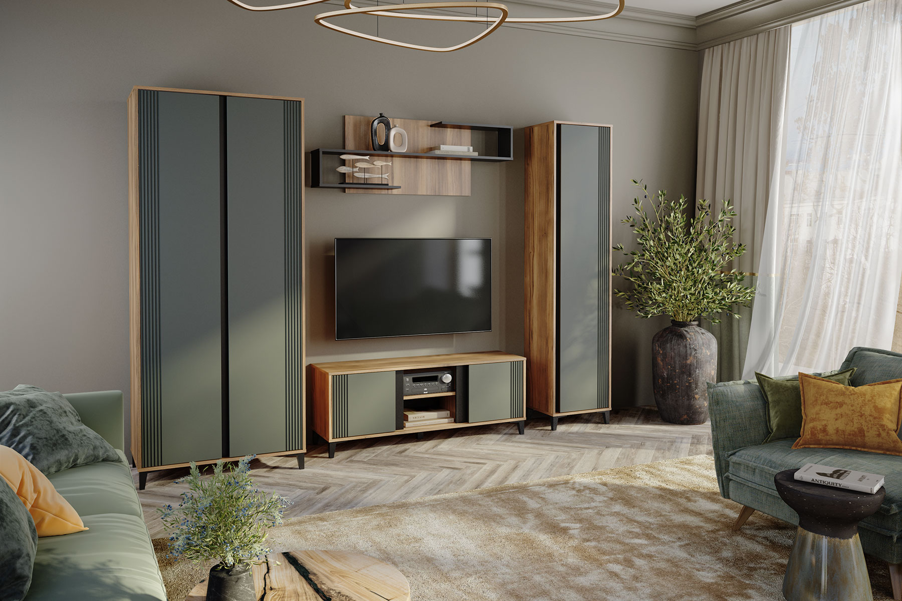 Стильная и современная модульная гостиная «Богемия» изготовлена из высококачественных материалов. Корпус изготовлен из ламинированной древесностружечной плиты толщиной 16мм. Фасады выполнены из МДФ толщиной 19мм и покрыты пленками ПВХ с эффектом Soft touch. Это обеспечивает не только стильный внешний вид, но и приятные тактильные ощущения. Цвета фасадов - зеленый и бежевый, гармонично сочетаются друг с другом и с корпусом мебели. Дизайн гостиной подчеркивает эффектный контраст материалов и цветов.