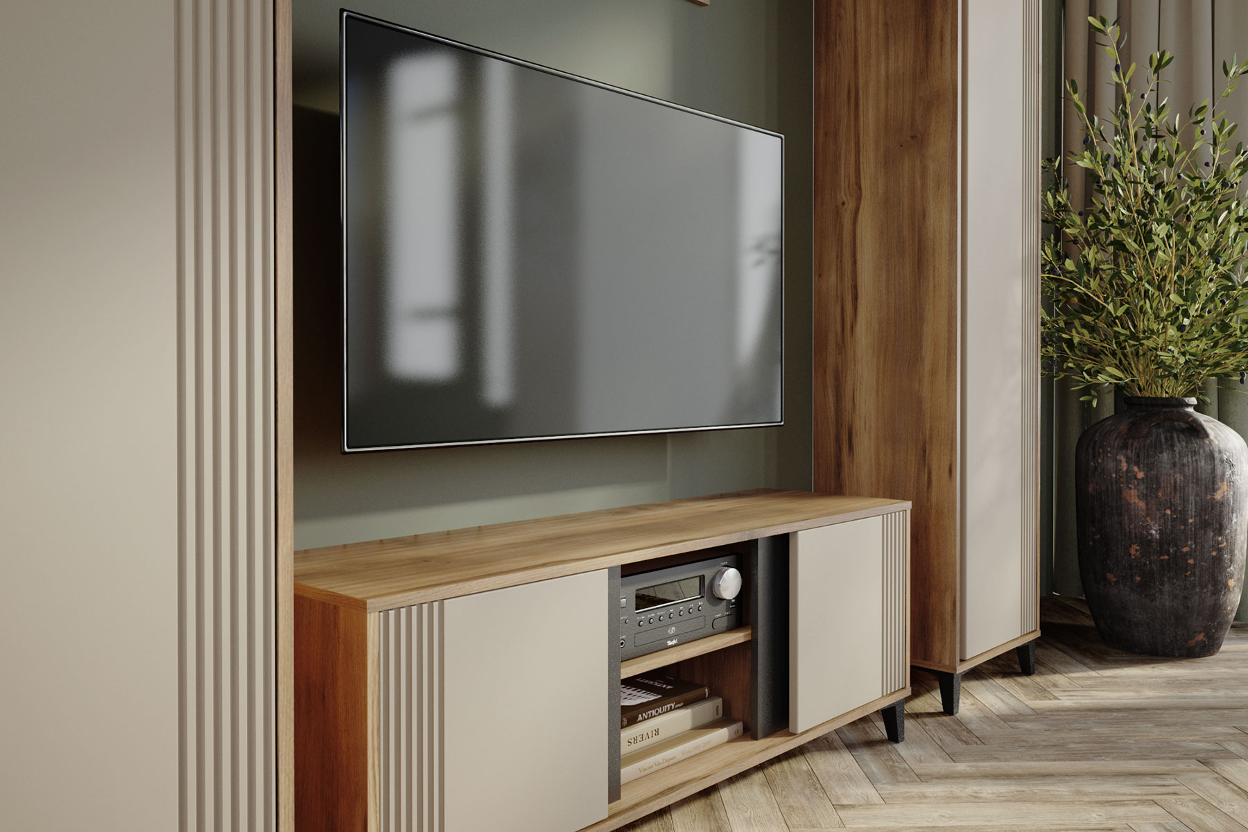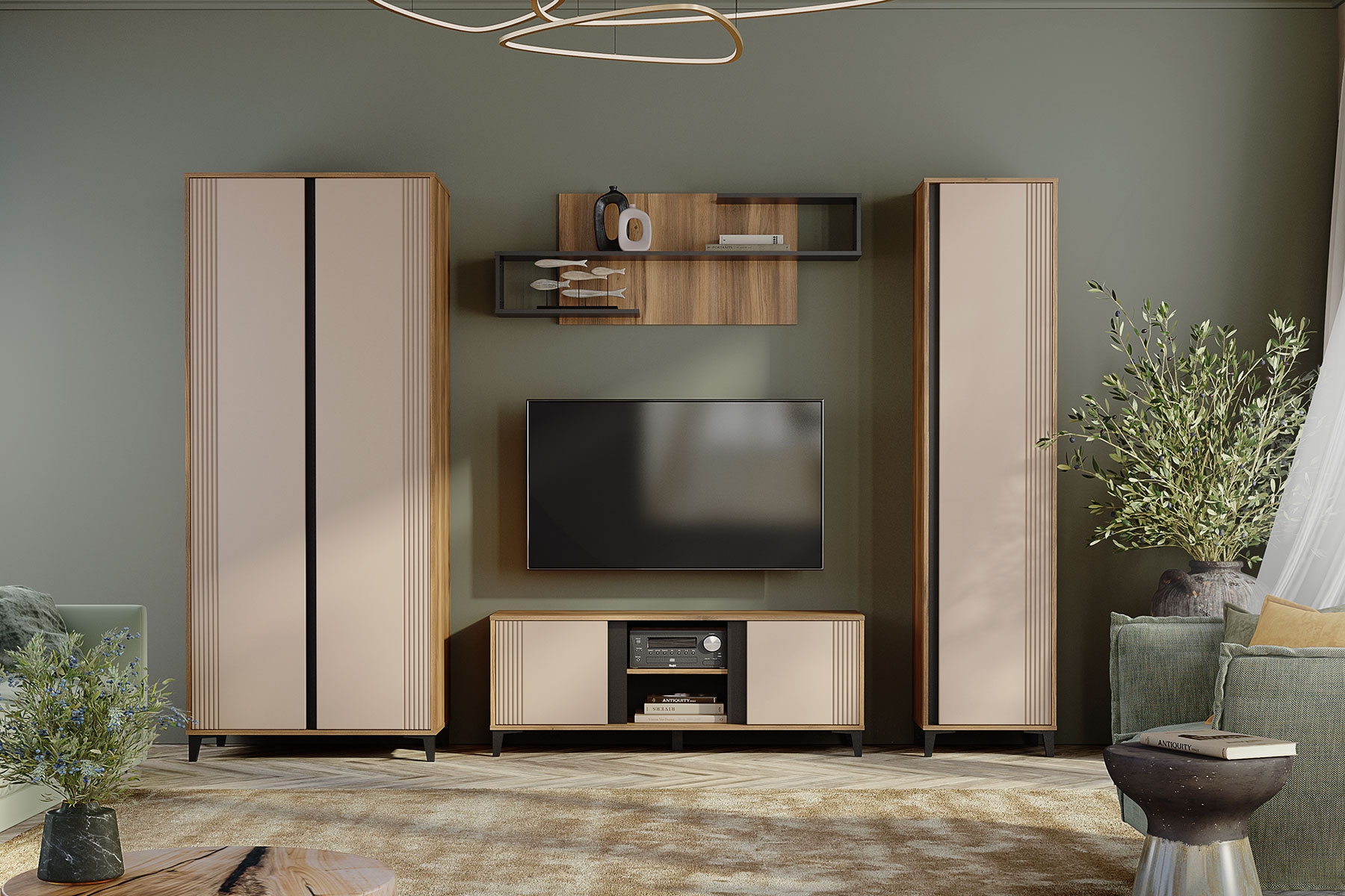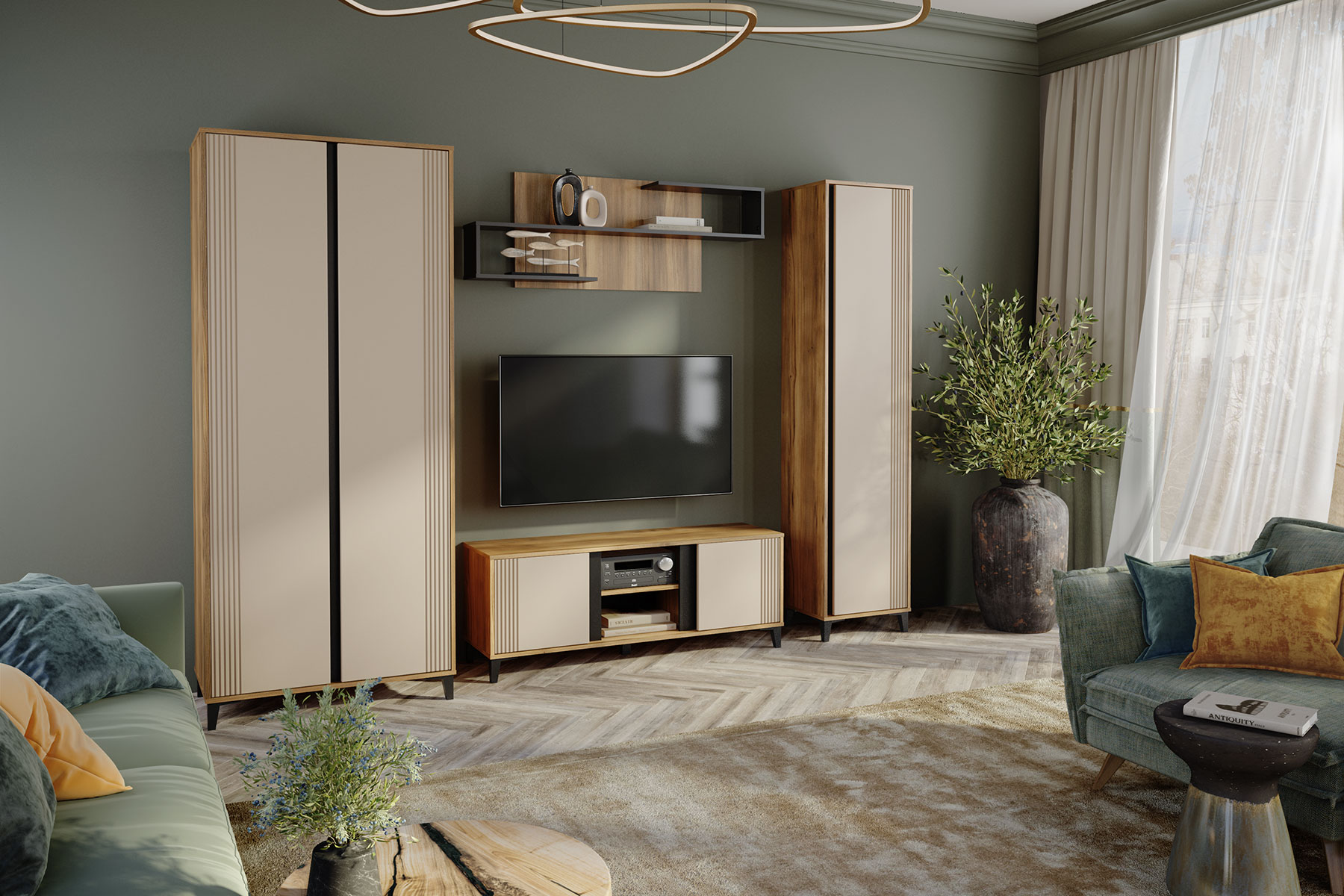 Стильная и современная модульная гостиная «Богемия» изготовлена из высококачественных материалов. Корпус изготовлен из ламинированной древесностружечной плиты толщиной 16мм. Фасады выполнены из МДФ толщиной 19мм и покрыты пленками ПВХ с эффектом Soft touch. Это обеспечивает не только стильный внешний вид, но и приятные тактильные ощущения. Цвета фасадов - зеленый и бежевый, гармонично сочетаются друг с другом и с корпусом мебели. Дизайн гостиной подчеркивает эффектный контраст материалов и цветов.