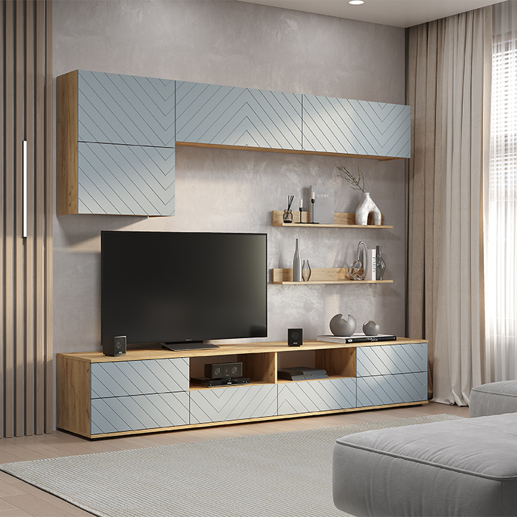 Гостиная «Камелия» - это комплексное решение для уютной гостиной. Разнообразие вместительных зон для хранения позволяет обустроить комфортную зону отдыха. Лаконичный дизайн и нежные оттенки фасадов «шарли пинк» и «шарли бриз» создают атмосферу расслабленности и гармонии. Фрезеровка на фасадах в виде геометрических узоров добавляет динамику в пространство и оживляет его.