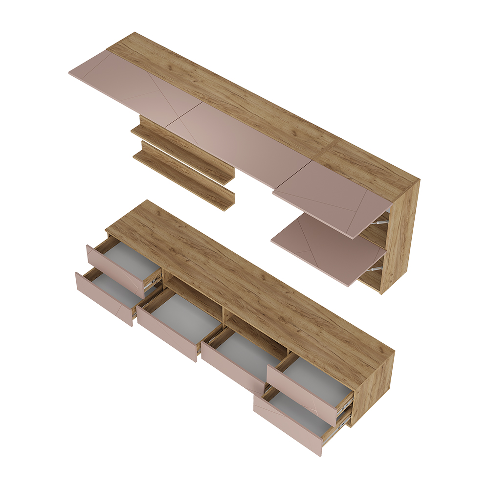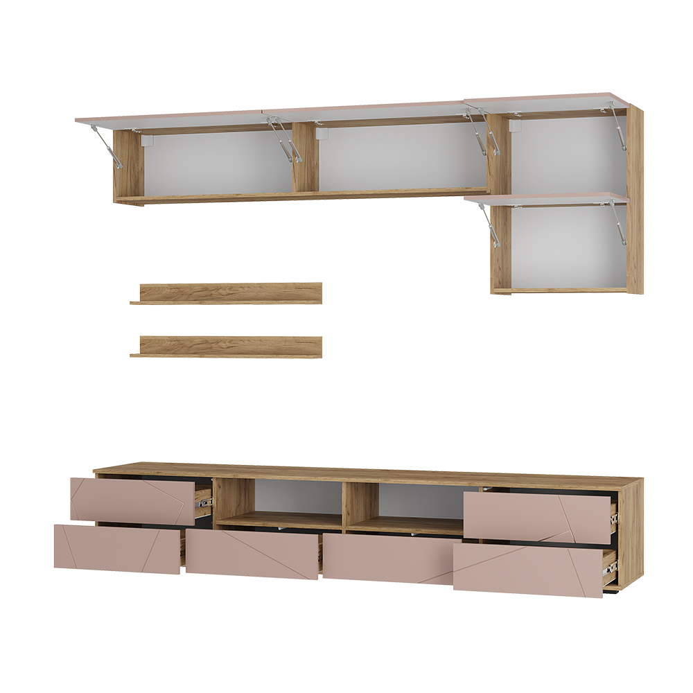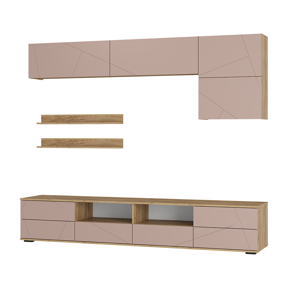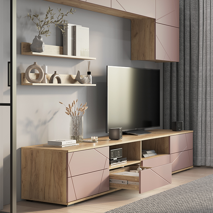 Гостиная «Камелия» - это комплексное решение для уютной гостиной. Разнообразие вместительных зон для хранения позволяет обустроить комфортную зону отдыха. Лаконичный дизайн и нежные оттенки фасадов «шарли пинк» и «шарли бриз» создают атмосферу расслабленности и гармонии. Фрезеровка на фасадах в виде геометрических узоров добавляет динамику в пространство и оживляет его.