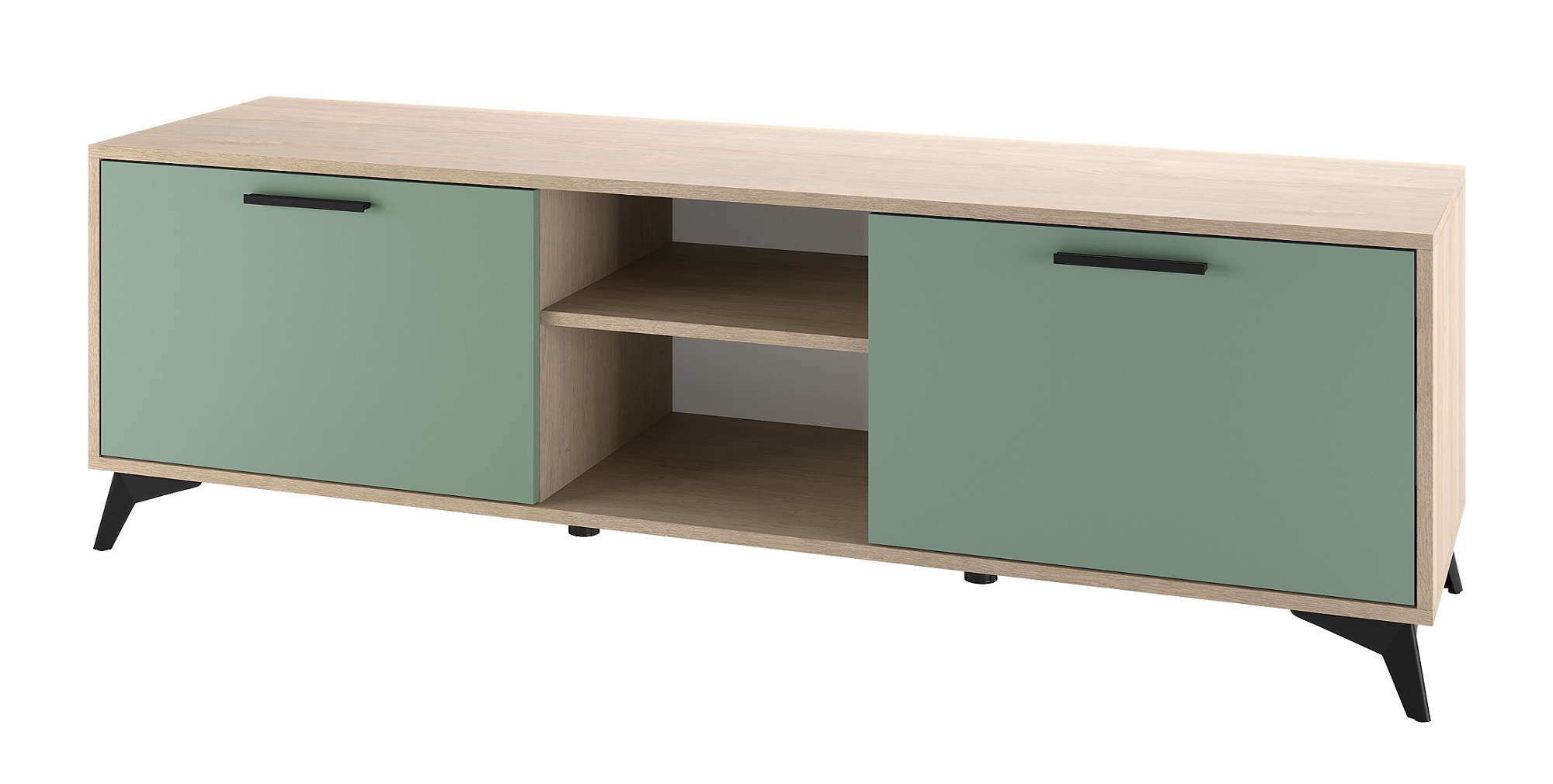 Тумба 1600 2С «ЕВА» с откидными створками на газлифтах. Фасады, крышка и лицевой периметр тумбы обработаны кромкой 1 мм. Чёрные металлические ручки и ножки-опоры.