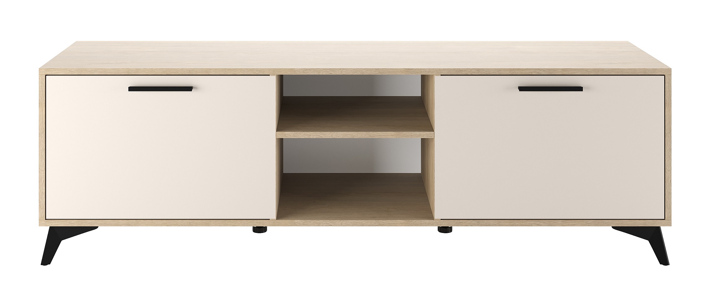 Тумба 1600 2С «ЕВА» с откидными створками на газлифтах. Фасады, крышка и лицевой периметр тумбы обработаны кромкой 1 мм. Чёрные металлические ручки и ножки-опоры.