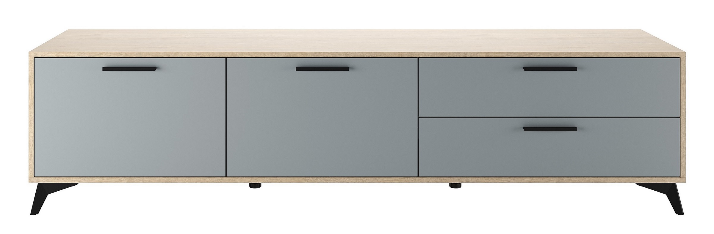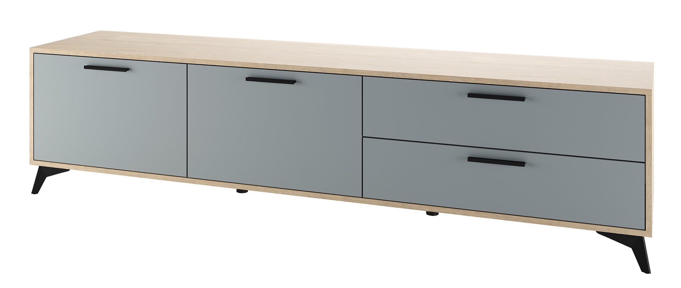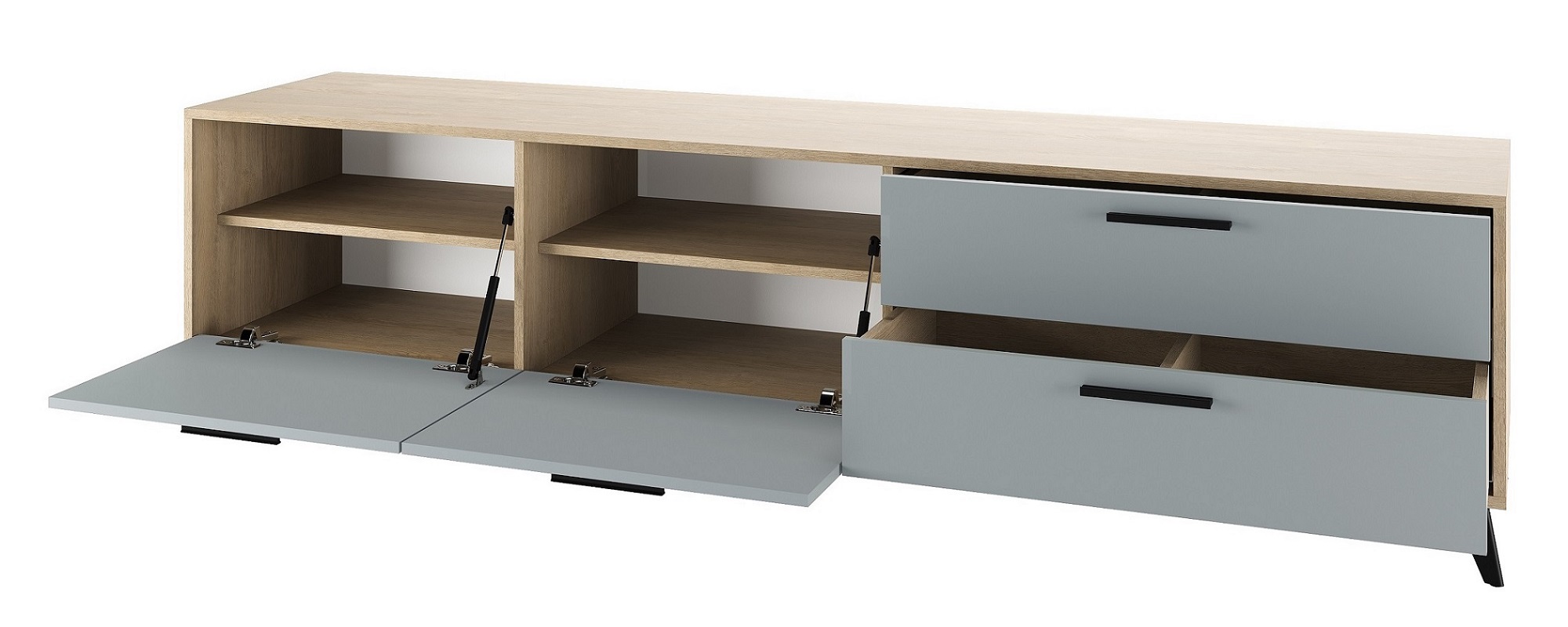 Тумба 2000 2С2Я «ЕВА» с откидными створками на газлифтах и ящиками на направляющих скрытого монтажа с доводчиками. Фасады, крышка и лицевой периметр тумбы обработаны кромкой 1 мм. Чёрные металлические ручки и ножки-опоры