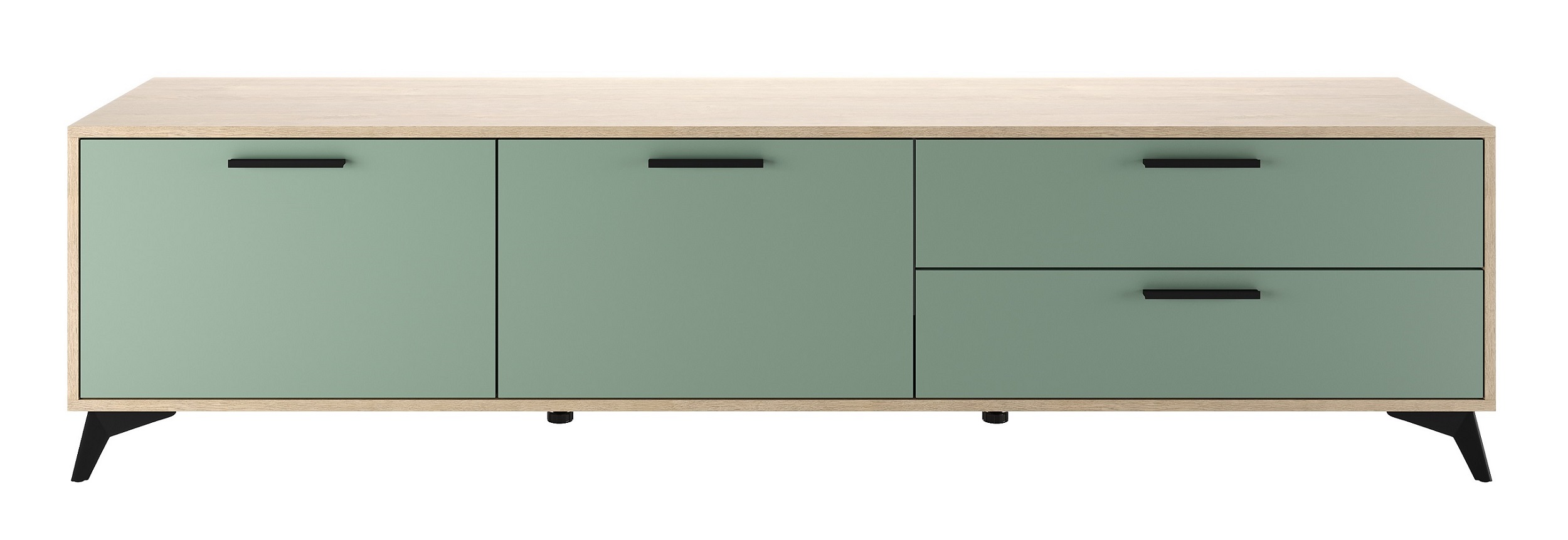 Тумба 2000 2С2Я «ЕВА» с откидными створками на газлифтах и ящиками на направляющих скрытого монтажа с доводчиками. Фасады, крышка и лицевой периметр тумбы обработаны кромкой 1 мм. Чёрные металлические ручки и ножки-опоры