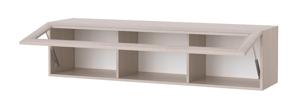 Полка-витрина 1490 «Октава» навесная. Крепится к стене через навесные элементы. Периметр фасада обрамлён профилем MDF оригинальной формы с патиной (окраской фасок) серебристого цвета. Для удобства открывания и удержания фасада в открытом положении устанавливаются газлифты.