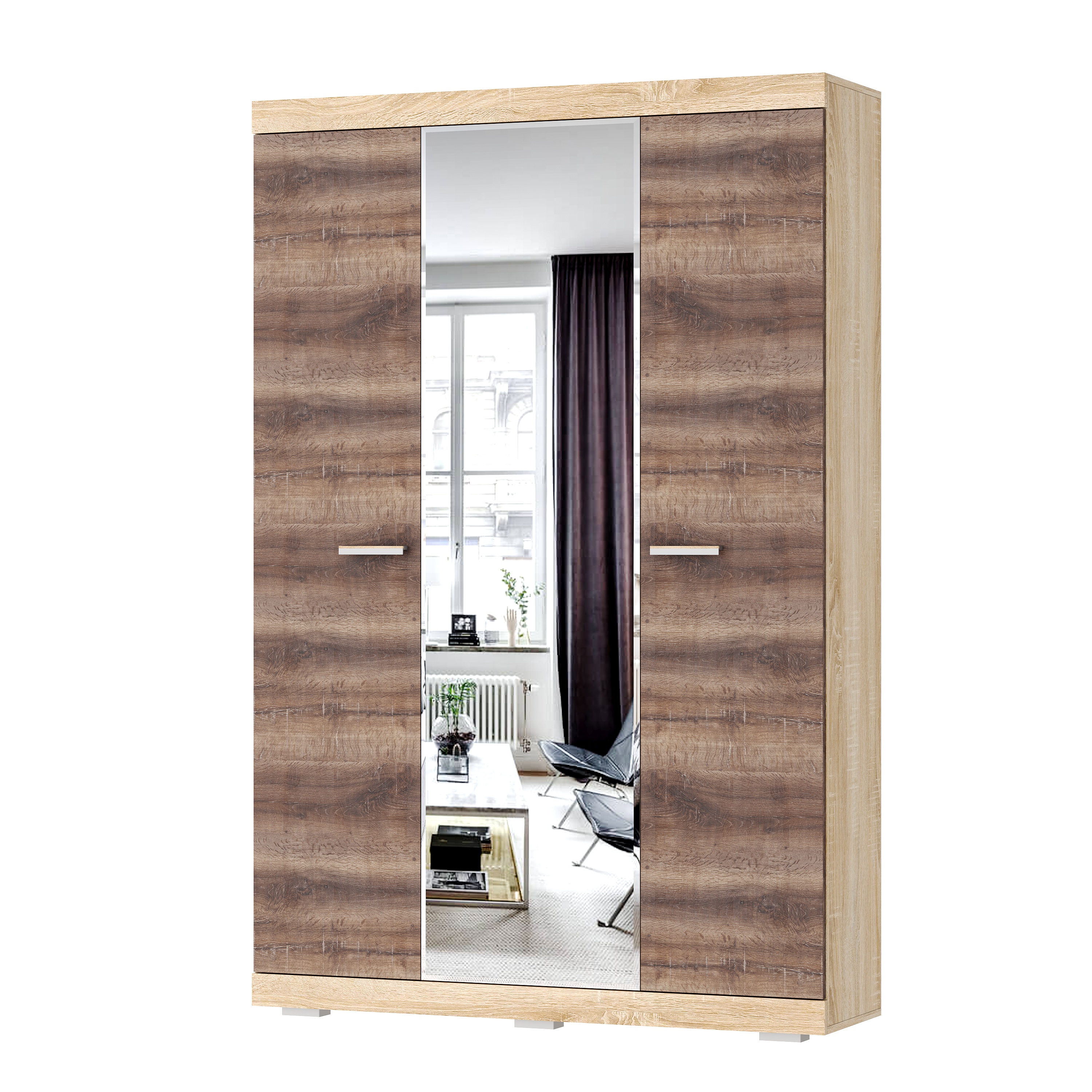 Шкаф «СОНАТА» ШСЗ-1300 трёхстворчатый с зеркалом, с полками и выдвижной штангой для верхней одежды. Верхняя и нижняя части шкафа обрамлёны профилем MDF. Зеркало выполнено с изящной и красивой обработкой «фацет» по периметру.