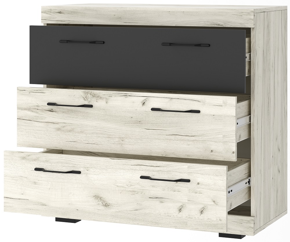 Комод КС-900 «СОНАТА» с 3-мя ящиками на направляющих полного выдвижения. Устанавливается стильная металлическая ручка, чёрная, матовая. Нижняя и верхняя части комода обрамлёны профилем MDF.