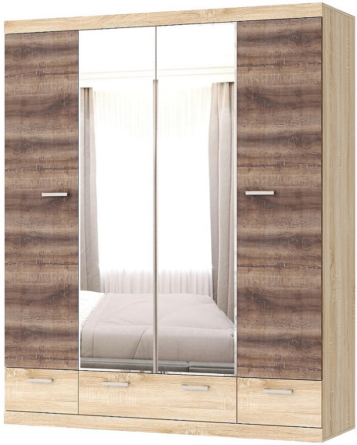 Шкаф «СОНАТА» ШСЗ-1800 четырёхстворчатый с зеркалами, с полками, металлической штангой штангой для верхней одежды и тремя ящиками на направляющих полного выдвижения. Верхняя и нижняя части шкафа обрамлёны профилем MDF. Зеркала выполнены с изящной и красивой обработкой «фацет» по периметру.
