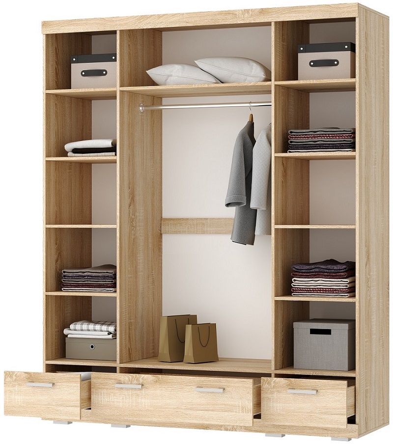 Шкаф «СОНАТА» ШСЗ-1800 четырёхстворчатый с зеркалами, с полками, металлической штангой штангой для верхней одежды и тремя ящиками на направляющих полного выдвижения. Верхняя и нижняя части шкафа обрамлёны профилем MDF. Зеркала выполнены с изящной и красивой обработкой «фацет» по периметру.