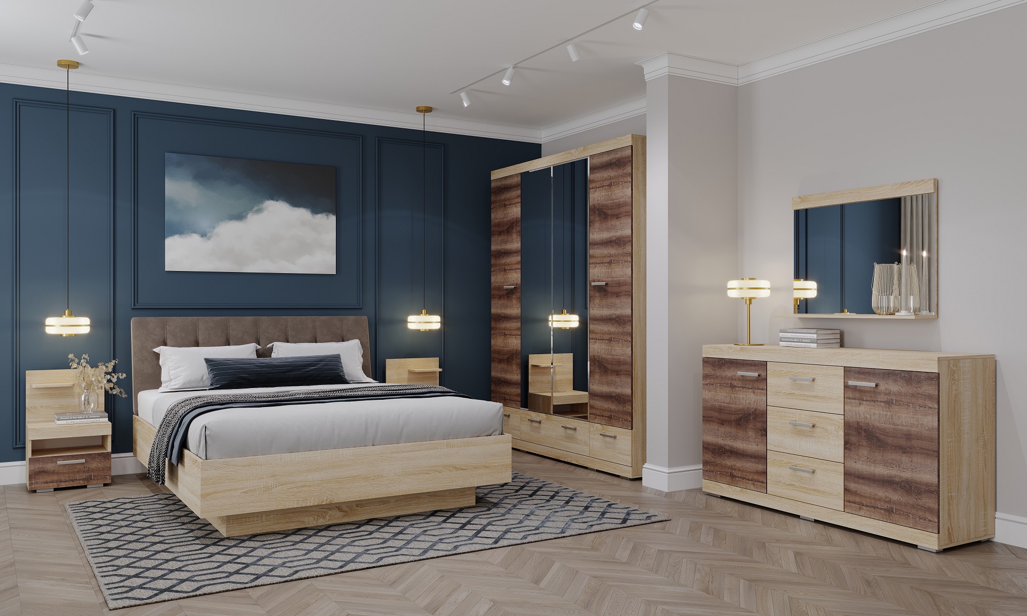 Обратите внимание на вместительные, внушительных габаритов шкафы и «парящие» кровати с различными вариантами изголовий: обшитые качественной тканью или в стиле-минимализме. Не хватает места для хранения вещей? Поднимаем основание кровати и пакуем кровать коробками!