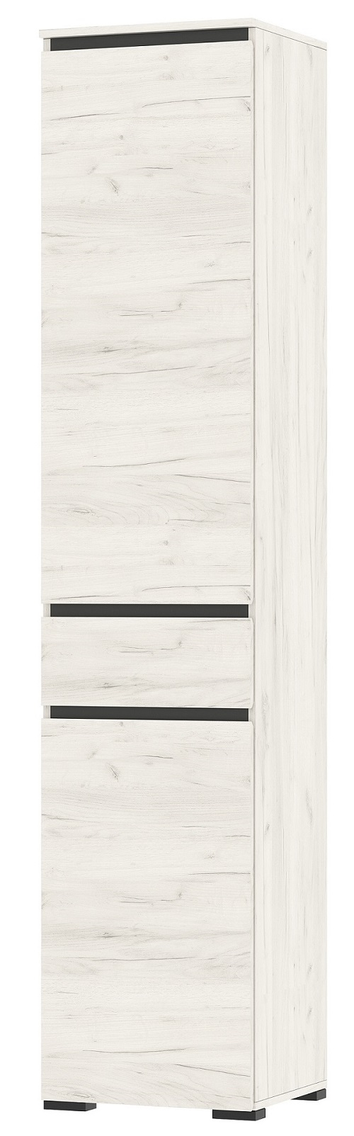 Пенал «ГРЕТТА» 2-створчатый с полками, с ящиком на направляющих полного выдвижения. Применение интегрированной ручки на фасадах делает модель стильной и безопасной – дверцы открываются за профилированные выступы. Фасады обработаны кромкой 1 мм. Чёрная регулируемая ножка-опора.