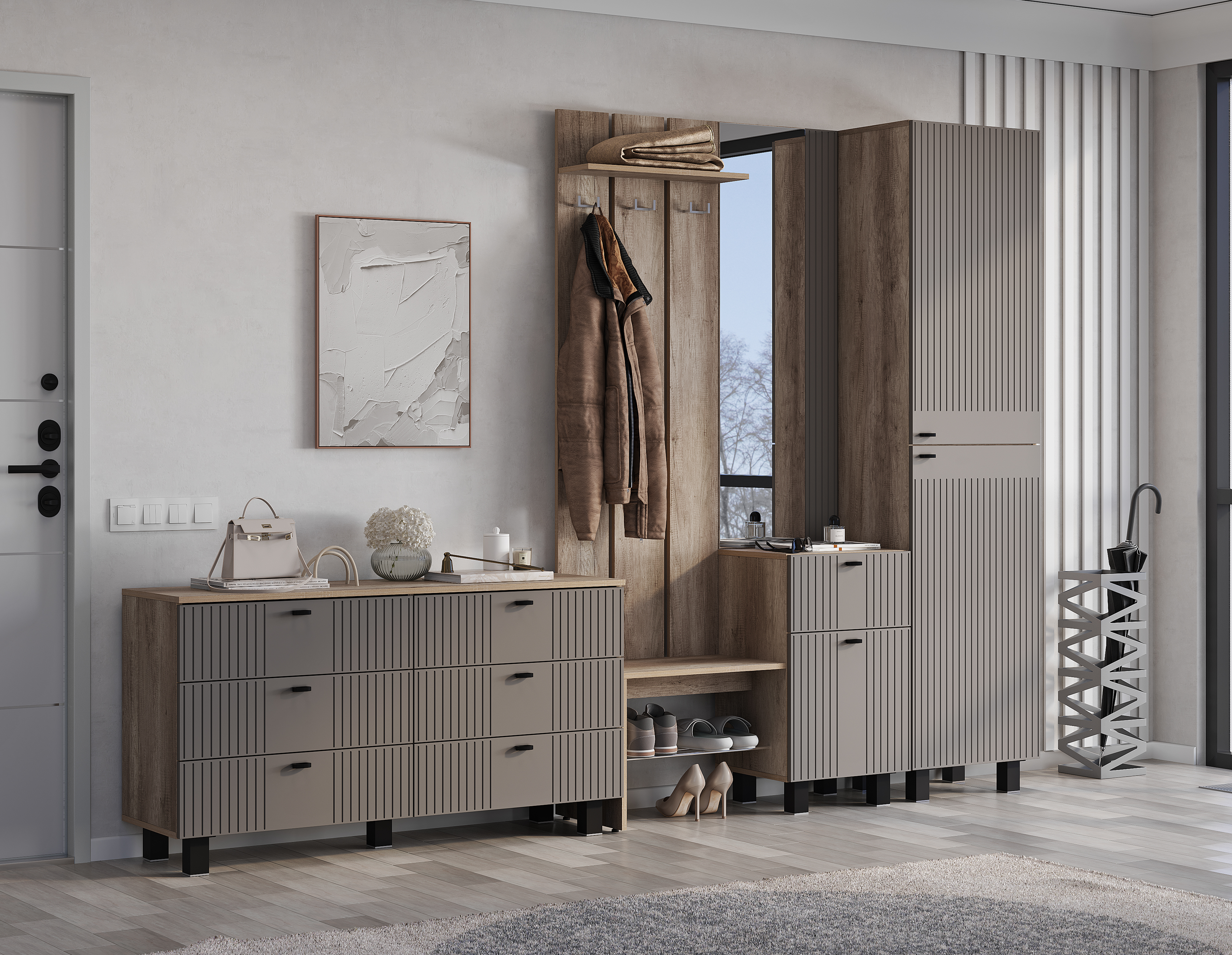 «Олива» - это элегантное и функциональное решение для любого интерьера. Коллекция представлена в трендовых пудровых оттенках. Фрезеровка на фасадах создает интересные текстурные контрасты и визуальные акценты. Кроме того, этот элемент декора также помогает скрыть мелкие загрязнения, что упрощает уход за мебелью. Черные металлические накладные ручки и петли с доводчиками обеспечивают удобство в использовании.