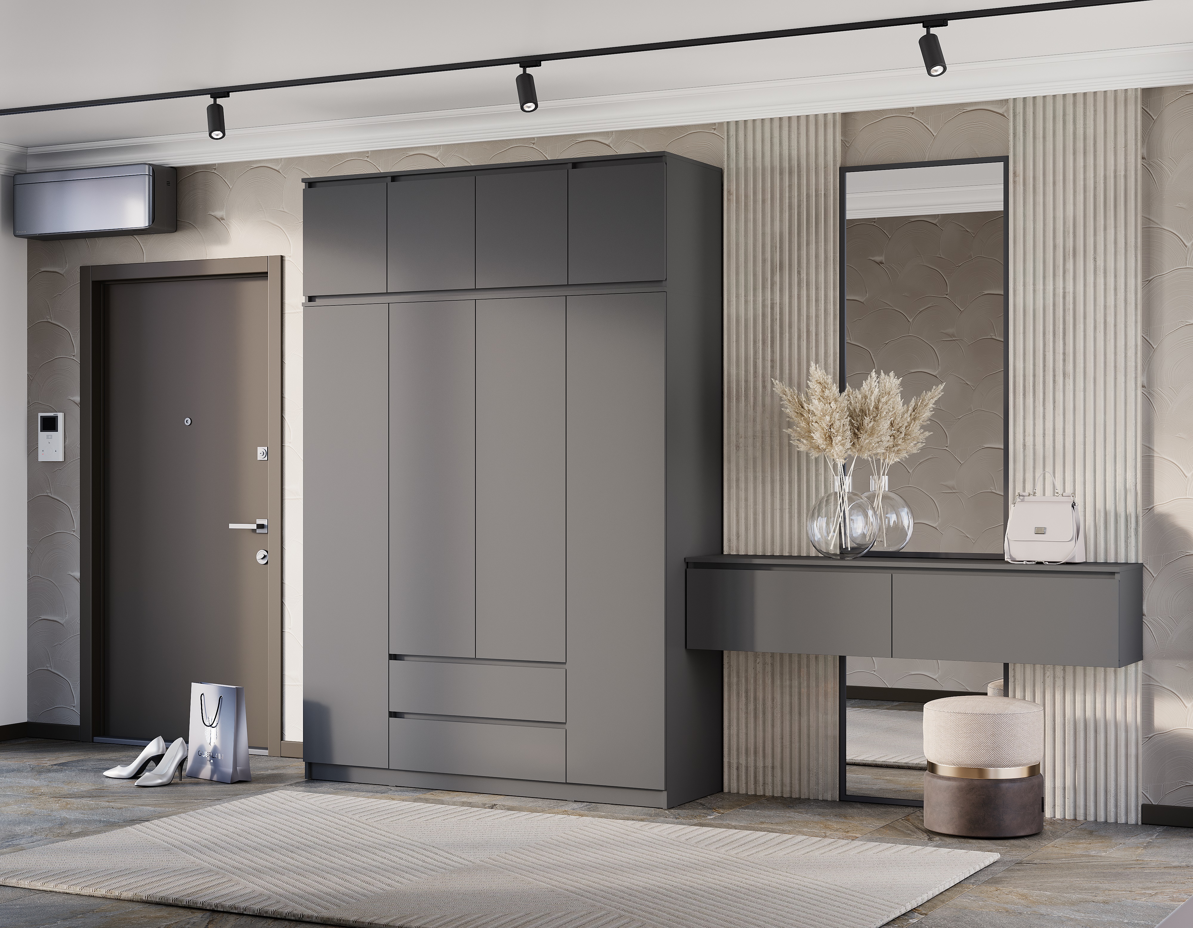 Отсутствует лицевая фурнитура. В распашных створках установлены отталкиватели (кроме тумбы ТБ-06 и тумбы ТБ-19). Мебель, выполненная в спокойных оттенках «белый» и «графит», идеально дополнит как классический, так и современный интерьер. Полноценный набор мебели позволяет экспериментировать с пространством.