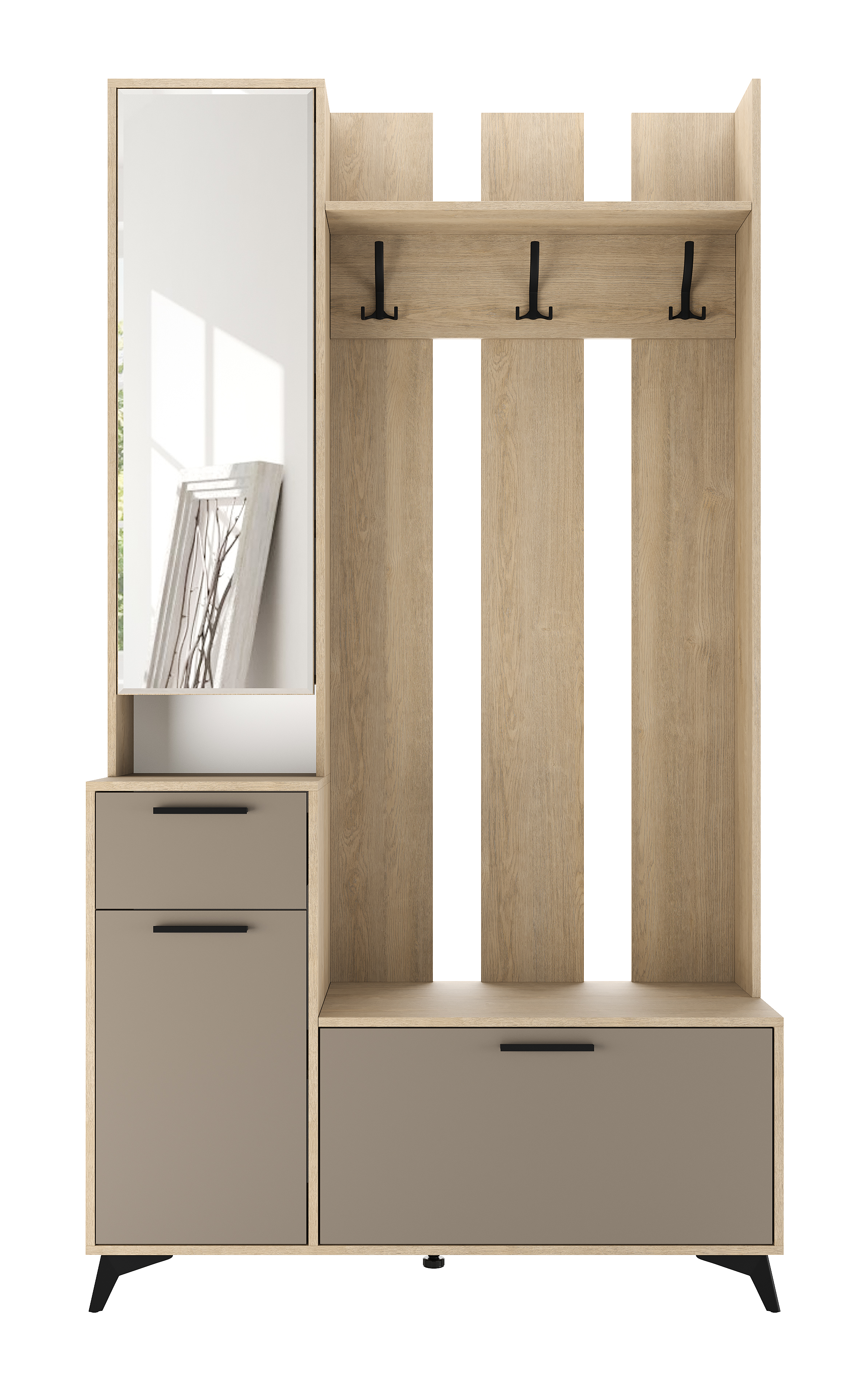 Модуль универсальный 1200 «ЕВА» с ящиком на направляющих скрытого монтажа с доводчиками. Фасады, лицевой периметр модуля обработаны кромкой 1 мм. Зеркало с обработкой «фацет» по периметру. Чёрные металлические ручки, крючки и ножки-опоры.