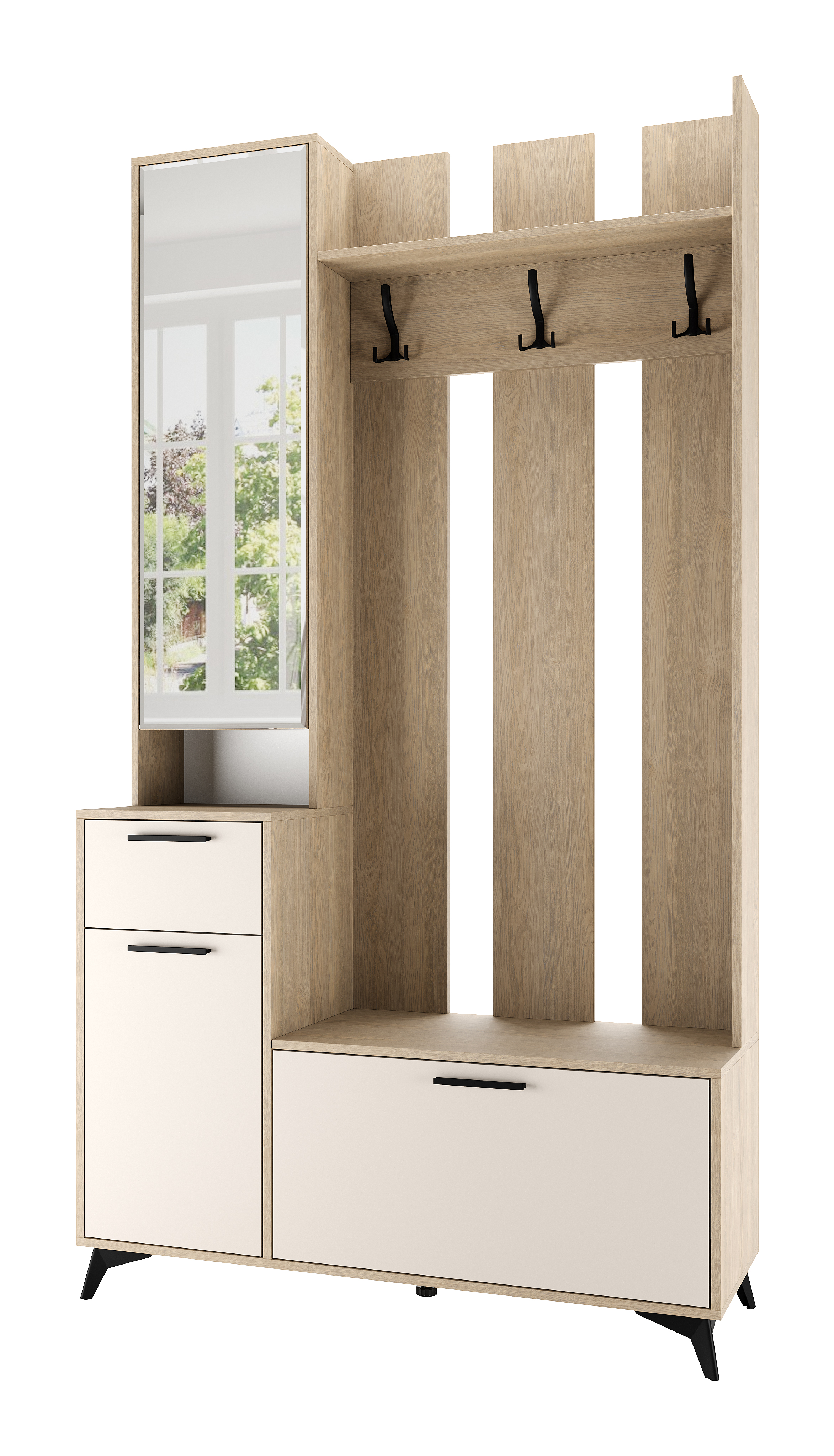 Модуль универсальный 1200 «ЕВА» с ящиком на направляющих скрытого монтажа с доводчиками. Фасады, лицевой периметр модуля обработаны кромкой 1 мм. Зеркало с обработкой «фацет» по периметру. Чёрные металлические ручки, крючки и ножки-опоры.
