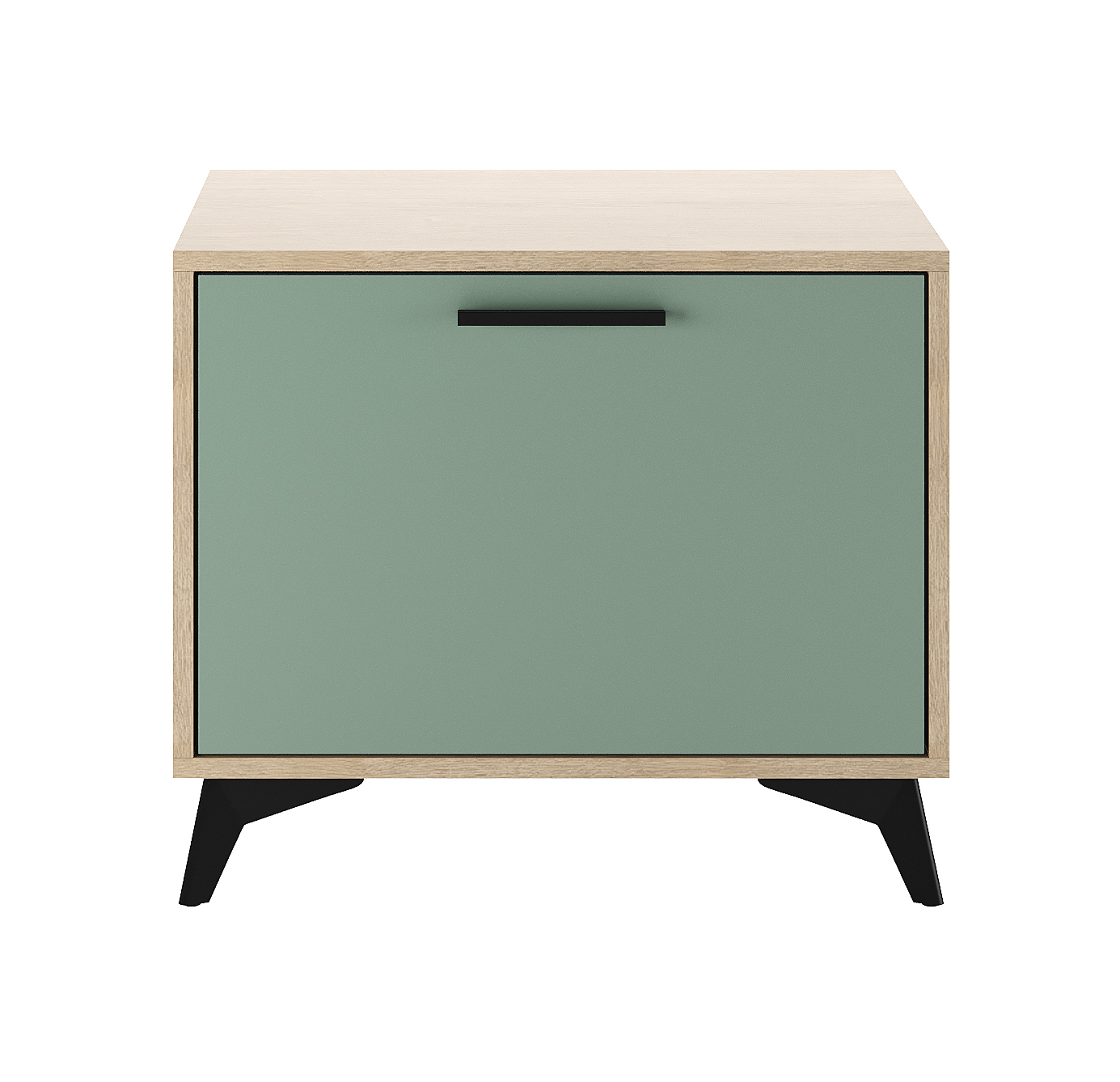 Тумба 600 1С «ЕВА» с откидным фасадом (газлифт). Фасад, крышка и лицевой периметр тумбы обработаны кромкой 1 мм. Чёрная металлическая ручка и ножки-опоры.