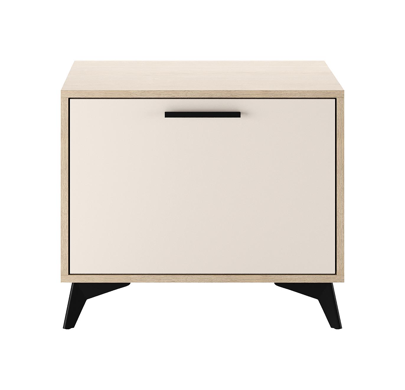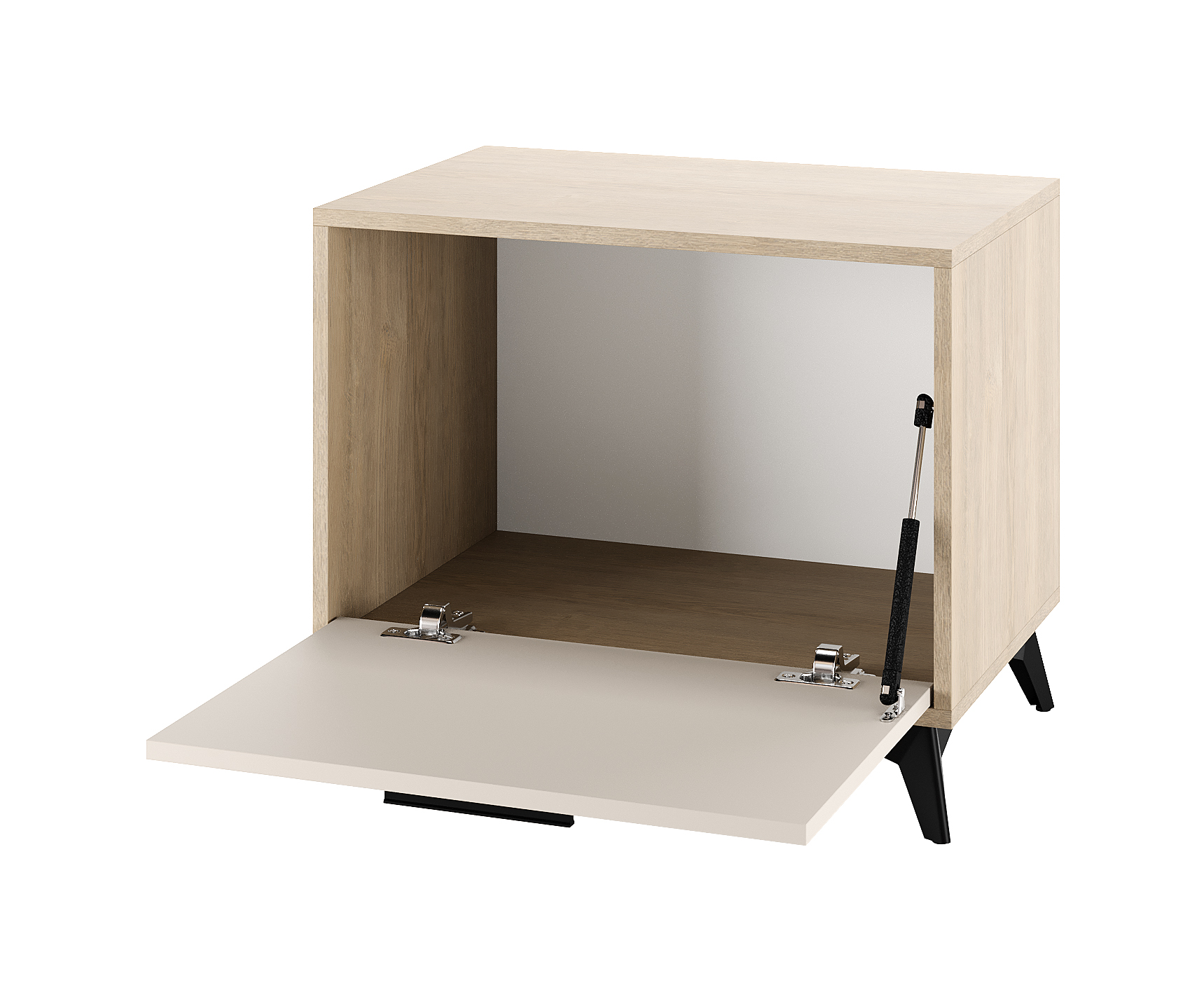 Тумба 600 1С «ЕВА» с откидным фасадом (газлифт). Фасад, крышка и лицевой периметр тумбы обработаны кромкой 1 мм. Чёрная металлическая ручка и ножки-опоры.