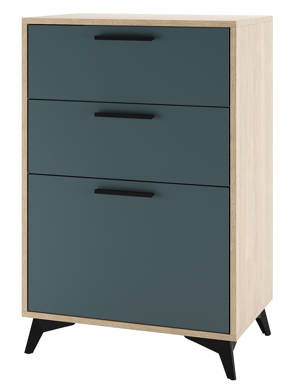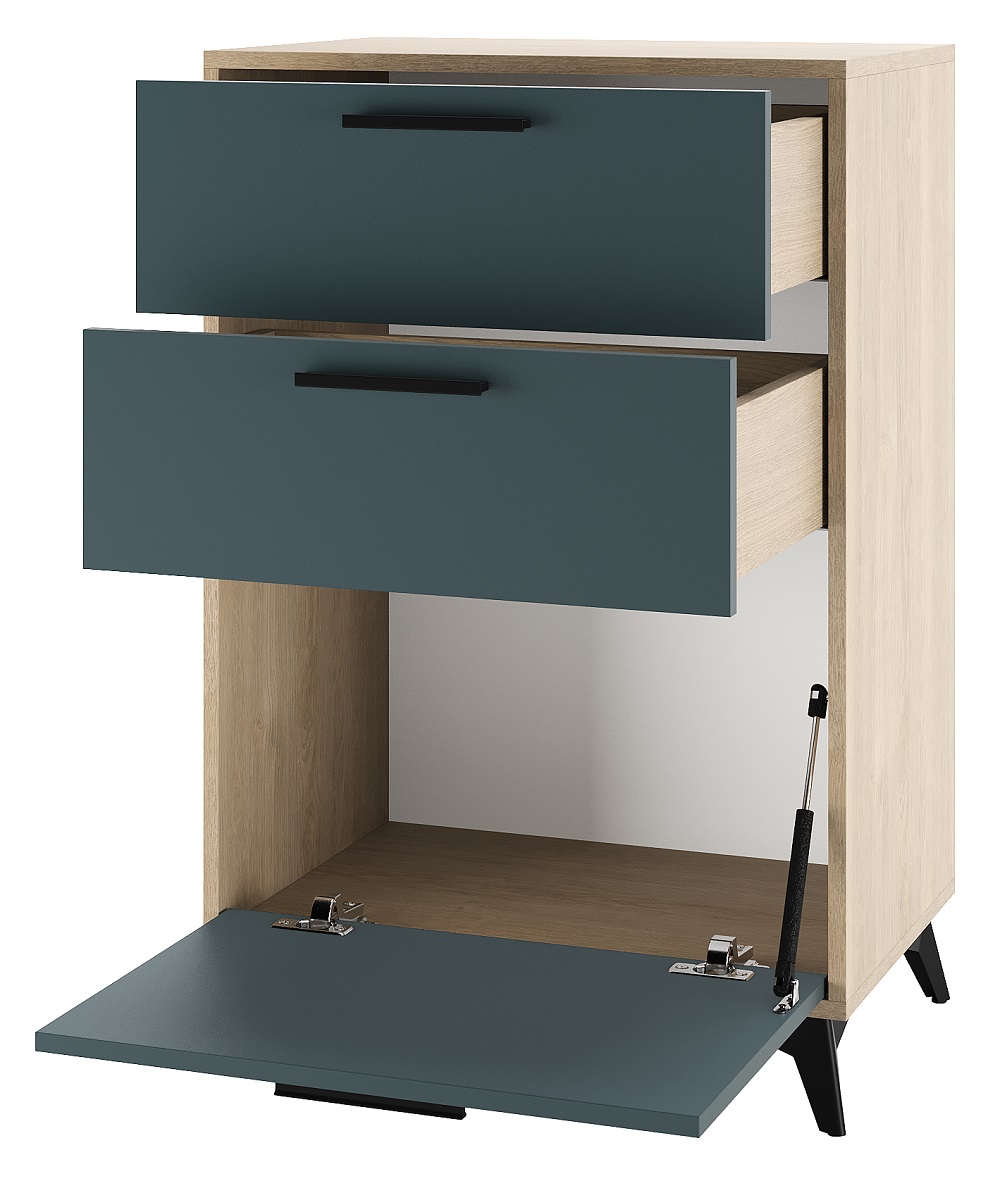 Тумба 600 1С2Я «ЕВА» с откидным фасадом (газлифт), с ящиками на направляющих скрытого монтажа с доводчиками. Фасады, крышка и лицевой периметр тумбы обработаны кромкой 1 мм. Чёрные металлические ручки и ножки-опоры.
