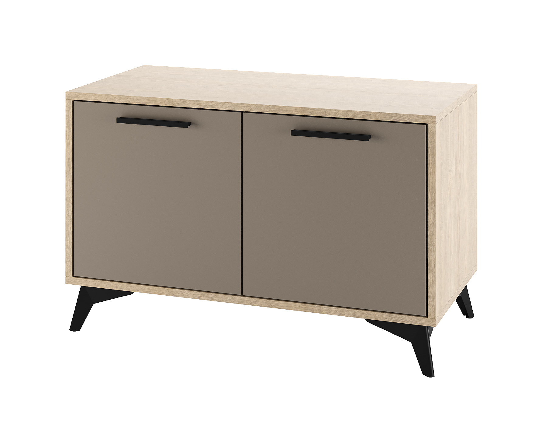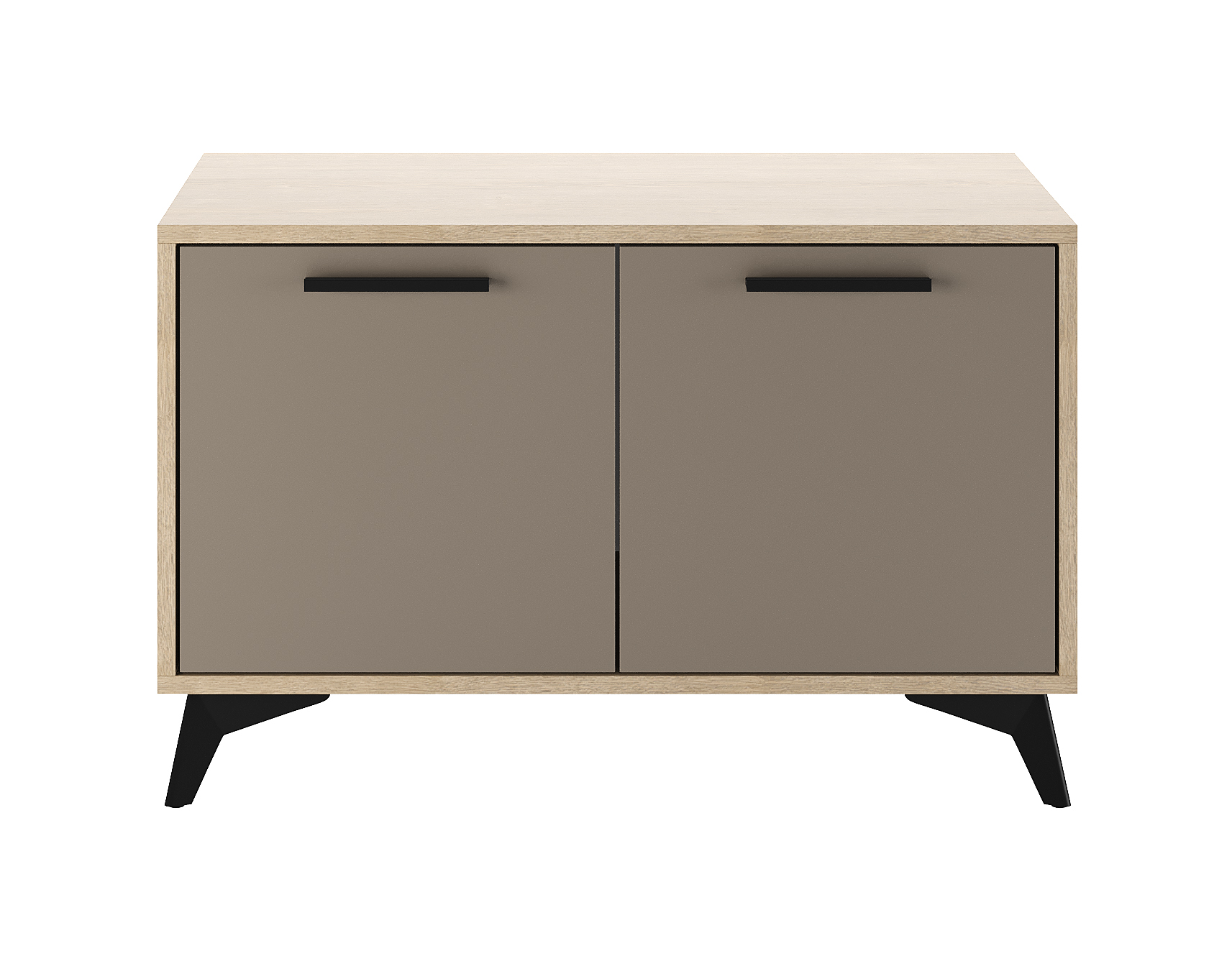 Тумба 800 2С «ЕВА» с распашными фасадами. Фасады, крышка и лицевой периметр тумбы обработаны кромкой 1 мм. Чёрные металлические ручки и ножки-опоры.