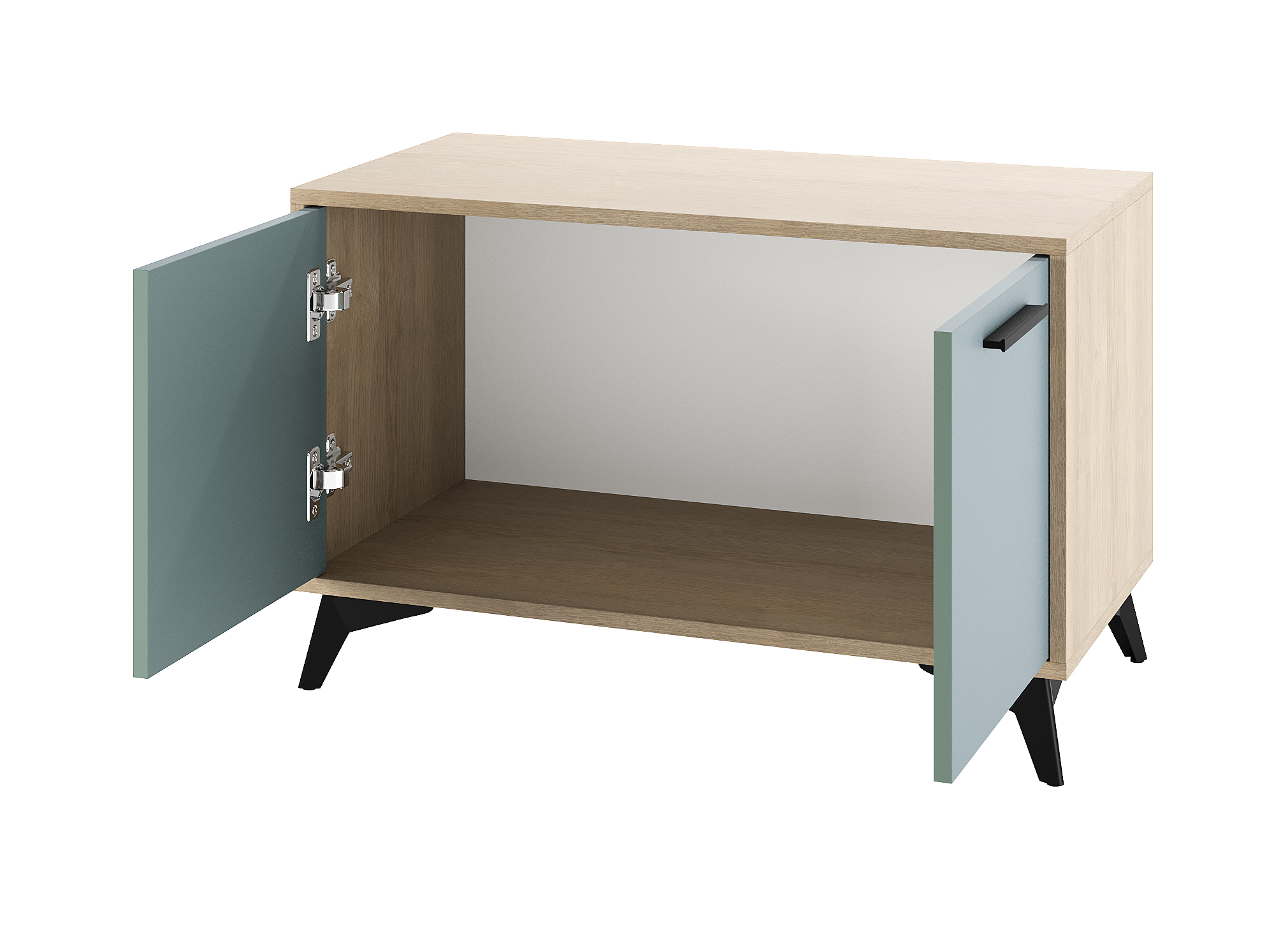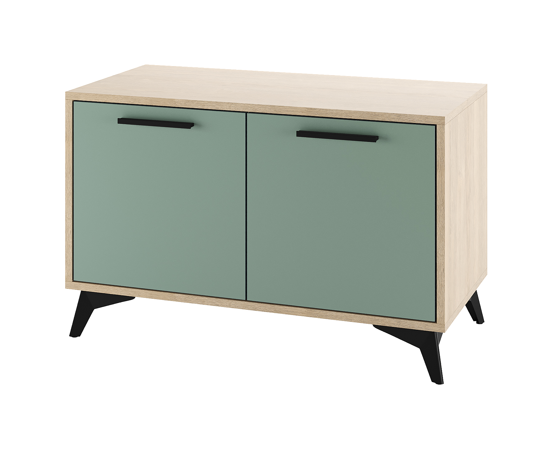 Тумба 800 2С «ЕВА» с распашными фасадами. Фасады, крышка и лицевой периметр тумбы обработаны кромкой 1 мм. Чёрные металлические ручки и ножки-опоры.