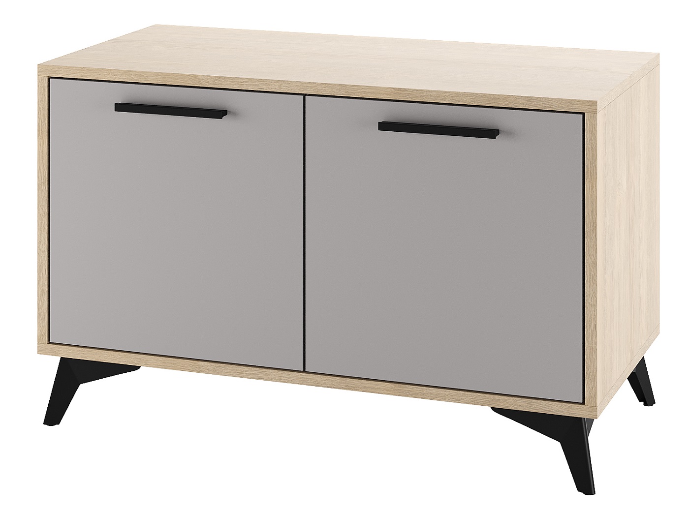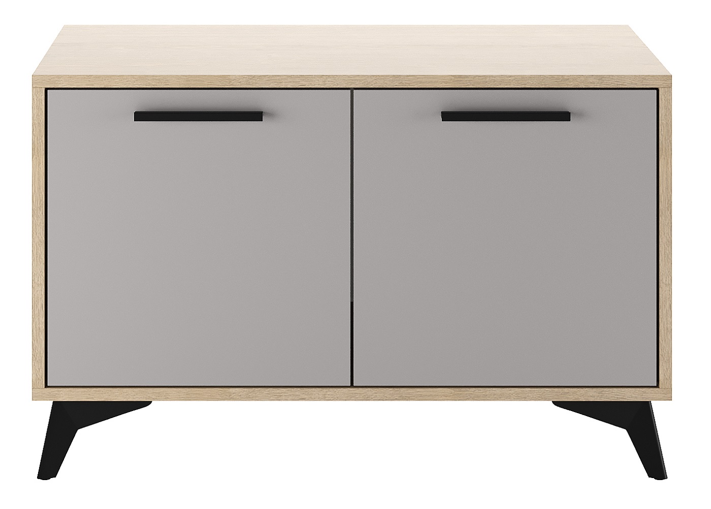 Тумба 800 2С «ЕВА» с распашными фасадами. Фасады, крышка и лицевой периметр тумбы обработаны кромкой 1 мм. Чёрные металлические ручки и ножки-опоры.