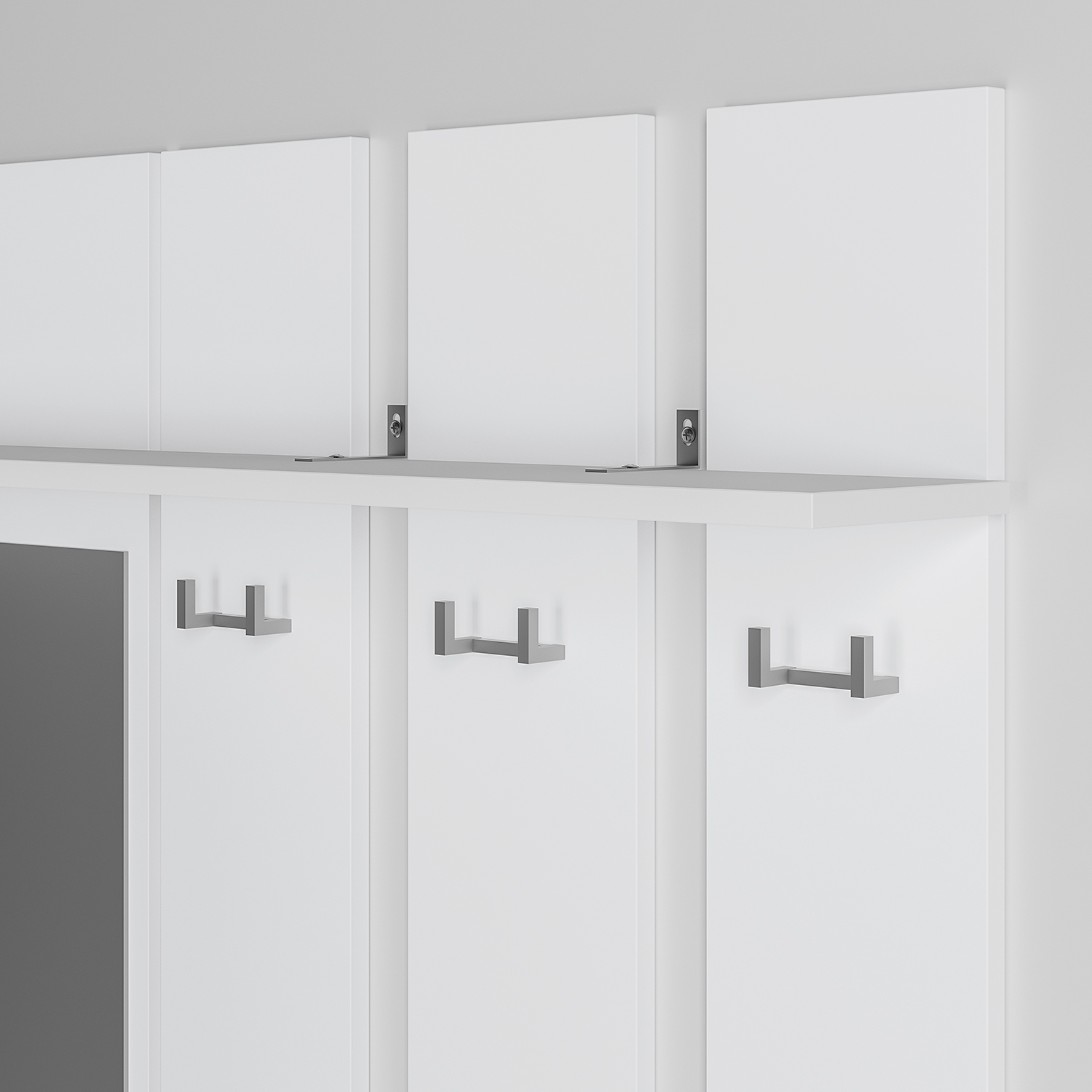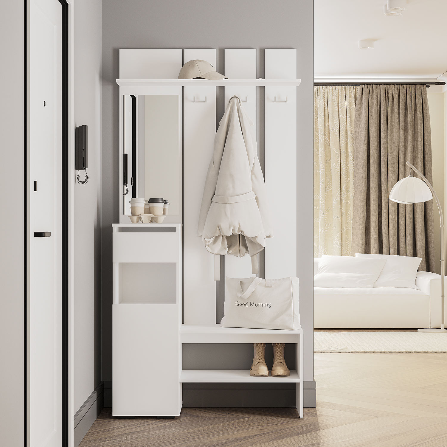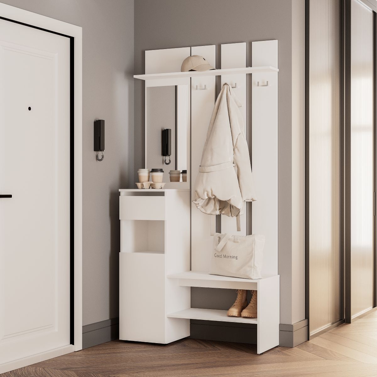 Прихожая «Мия» представлена в двух трендовых оттенках, которые дополнят прихожую в нейтральных тонах или подчеркнут пространство с яркими акцентами в интерьере. Простая геометрическая конструкция без лицевой фурнитуры создаст атмосферу лёгкости и визуально расширит прихожую. Для комфортной подготовки к выходу из дома модель дополнена вертикальным зеркалом.