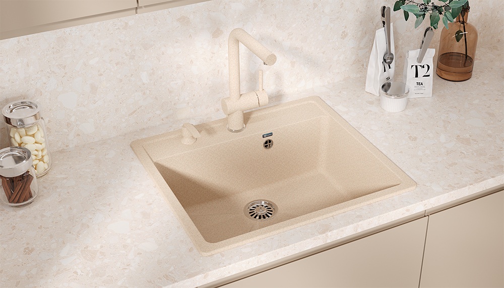 Искусственный камень хорошо поглощает звуки, поэтому шум воды практически отсутствует. А благодаря использованию гелькоута поверхность мойки не впитывает жир, грязь и не меняет цвет под воздействием солнечного света.