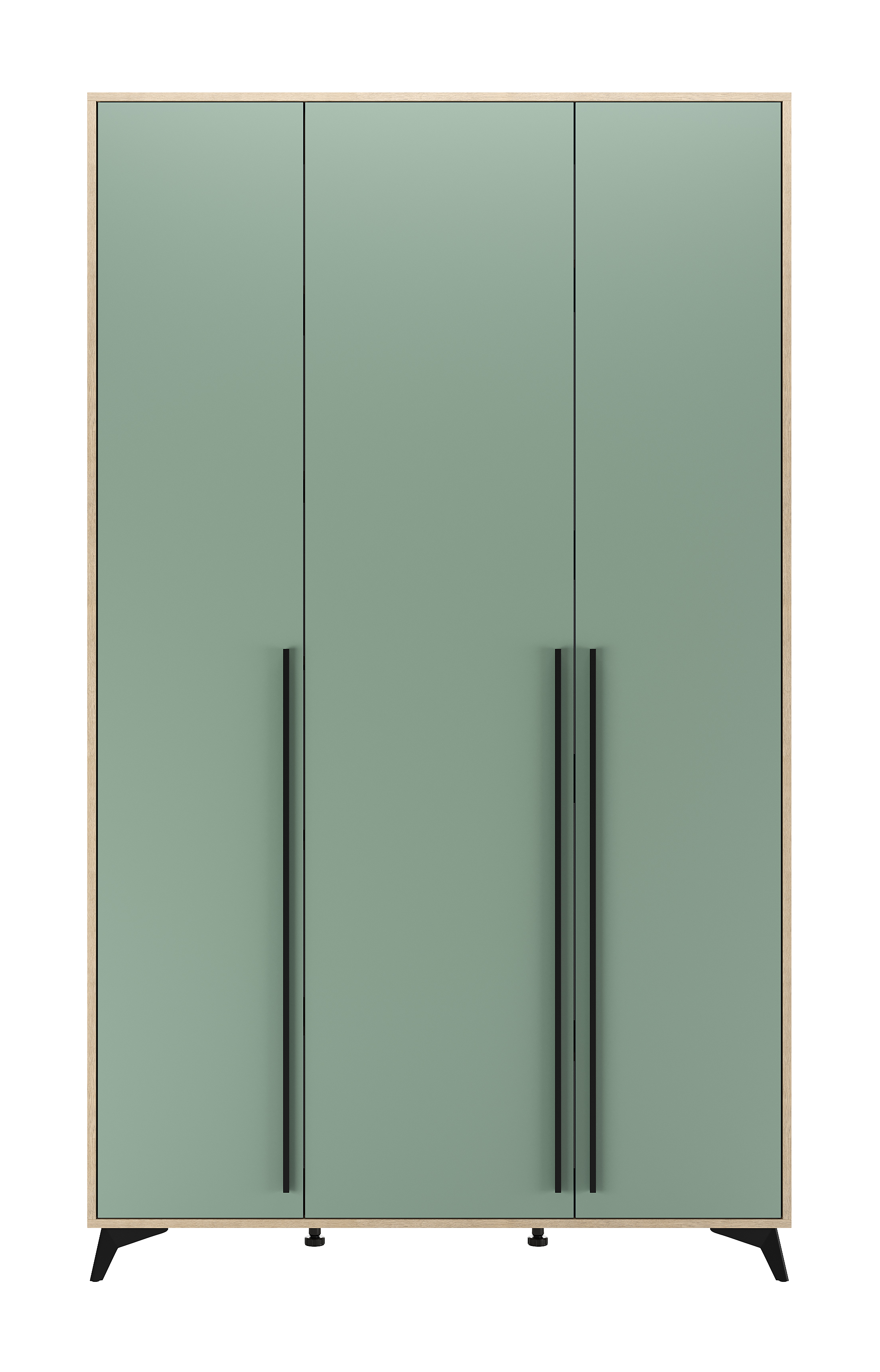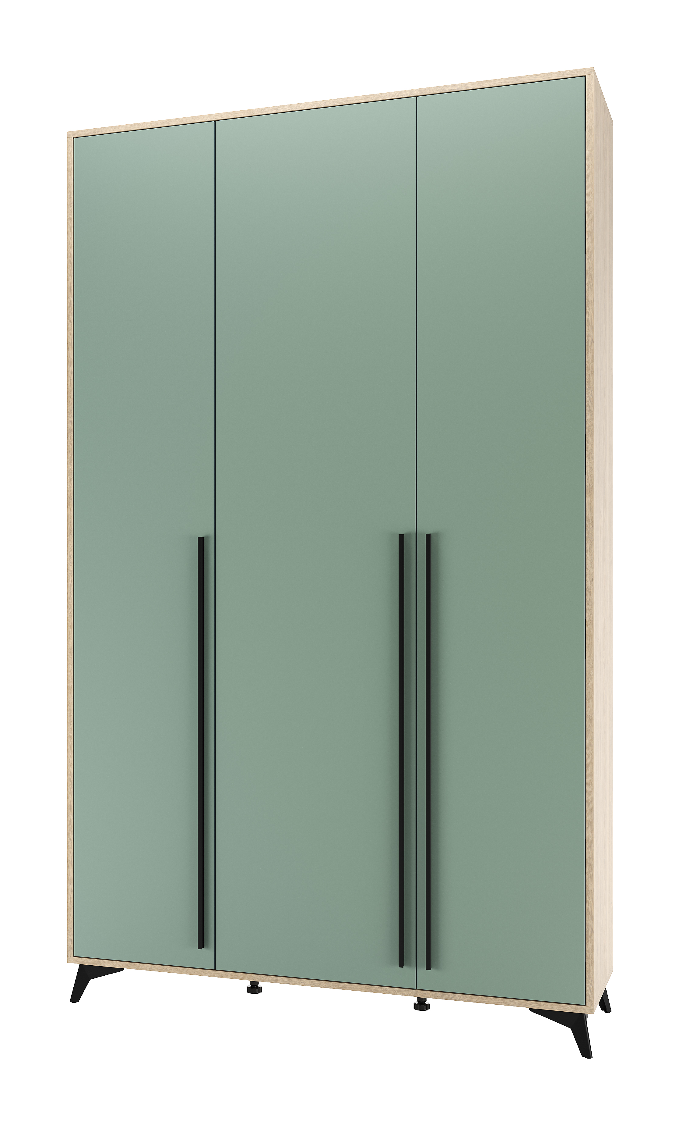 Шкаф 1300 3С «ЕВА» с выдвижными металлическими штангами, с полками. Фасады и лицевой периметр шкафа обработаны кромкой 1 мм. Чёрные металлические ручки-рейлинги и ножки-опоры.