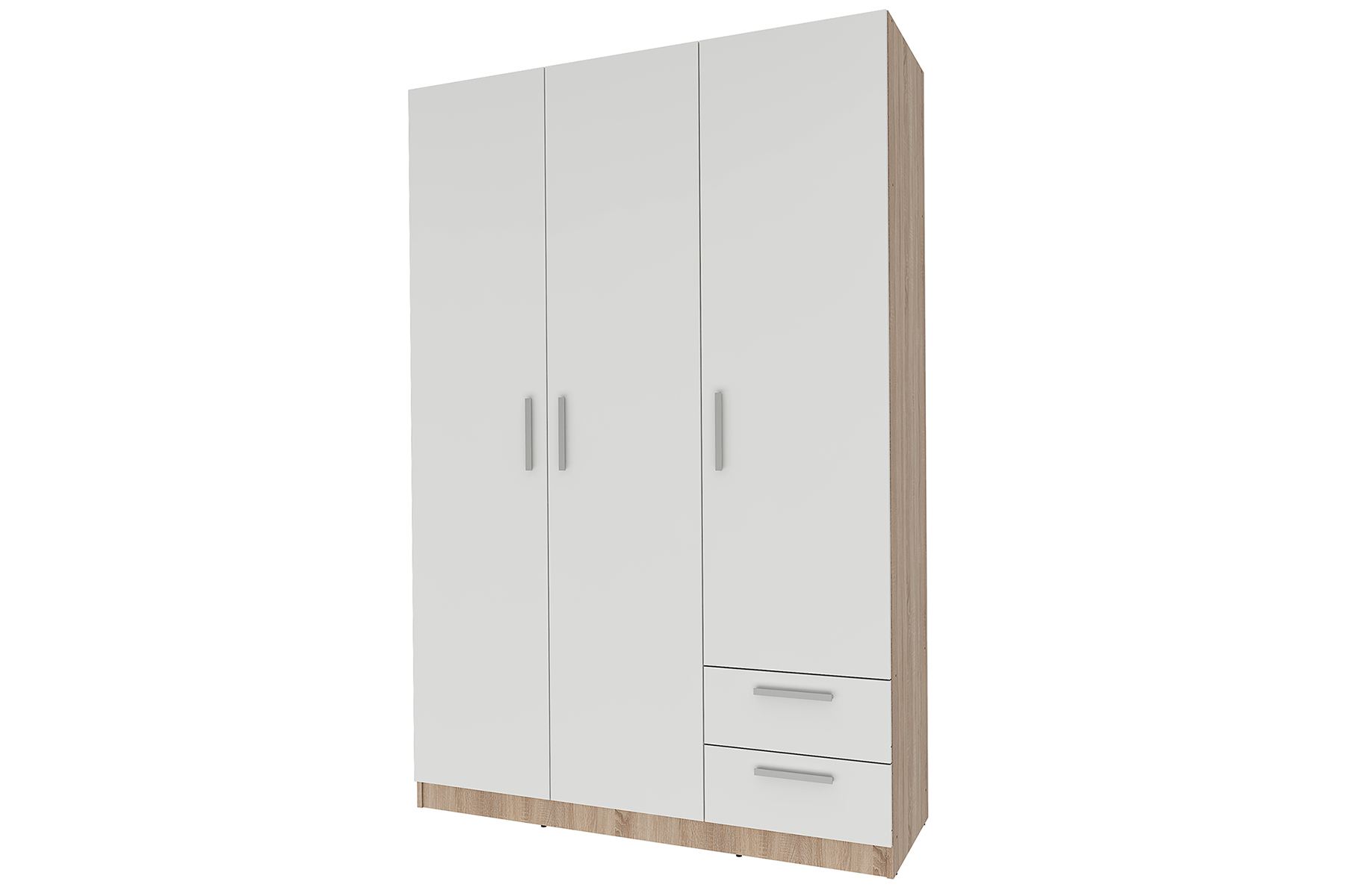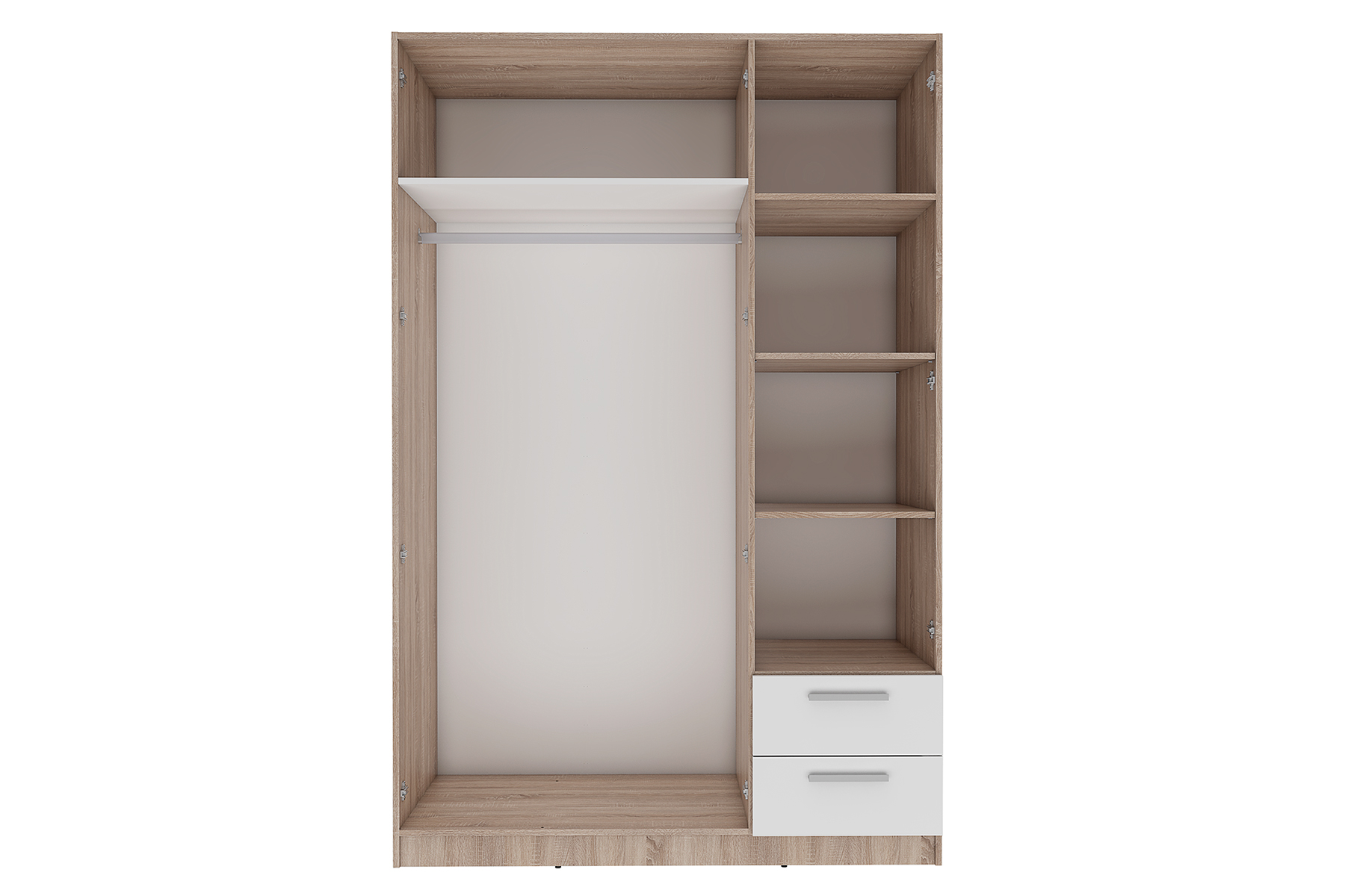 Фасады выполнены в белом цвете — чистом, светлом и универсальном. Он освежает пространство и легко сочетается с другими оттенками. Корпус выполнен в декоре «Дуб сонома», добавляя модели естественности и уюта. Это удачное сочетание делает шкаф визуально лёгким и тёплым.