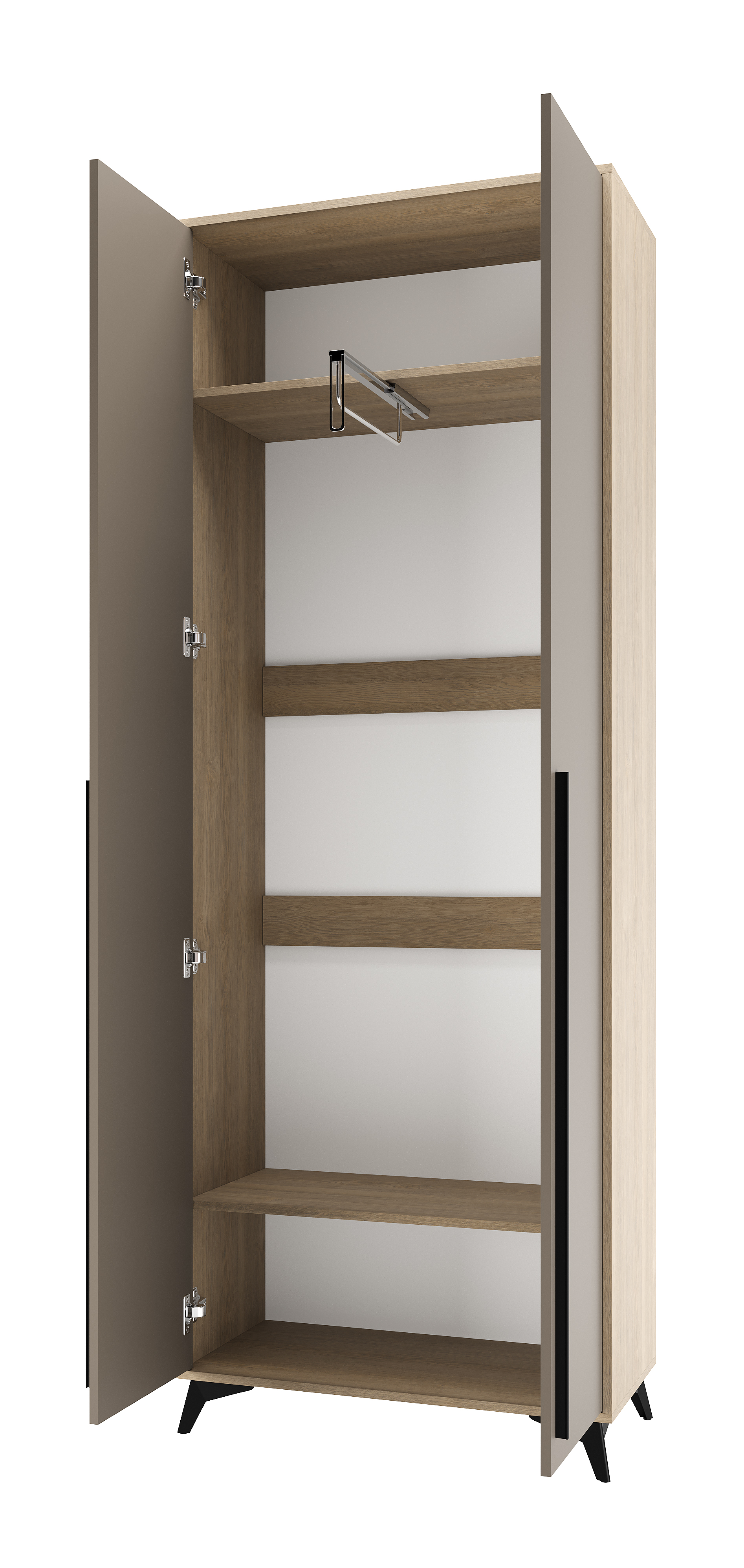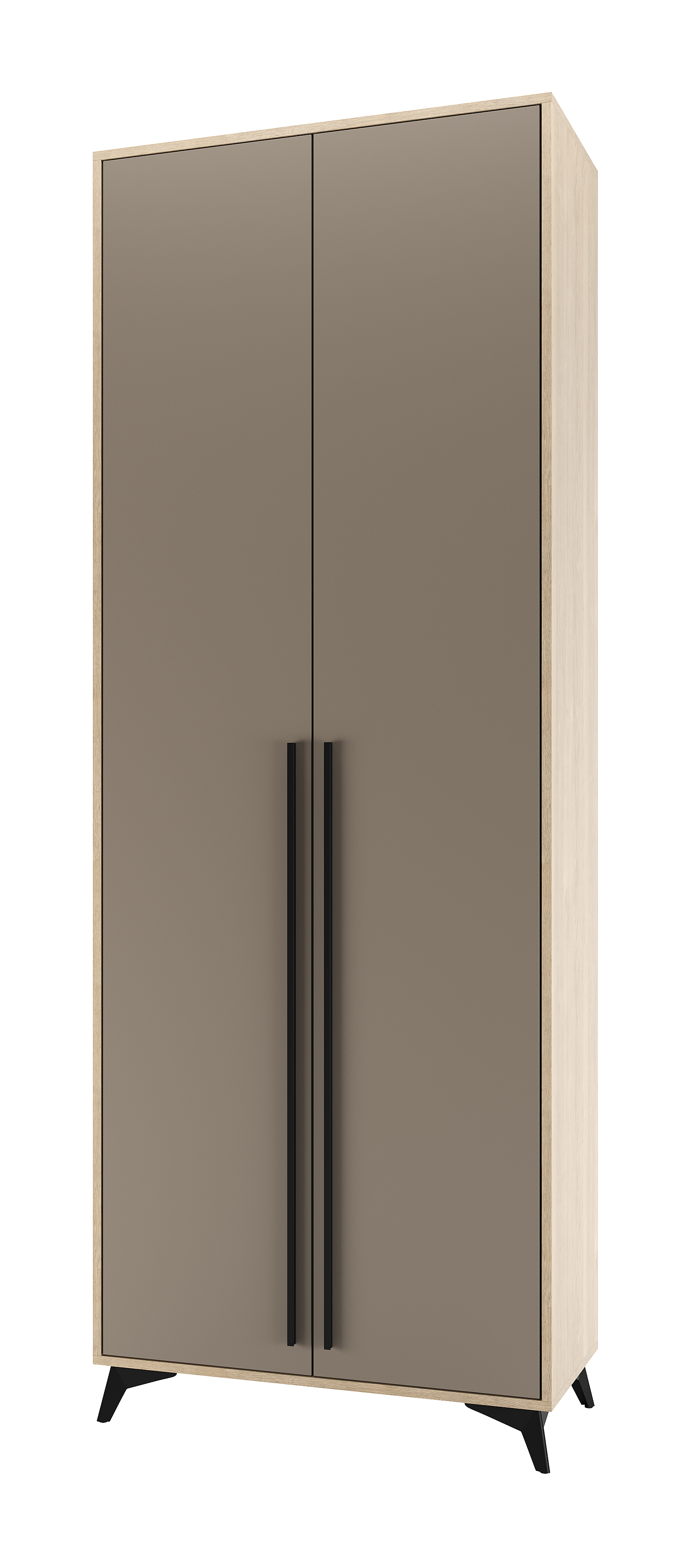 Шкаф 800 2С «ЕВА» с выдвижной металлической штангой. Фасады и лицевой периметр шкафа обработаны кромкой 1 мм. Чёрные металлические ручки-рейлинги и ножки-опоры.
