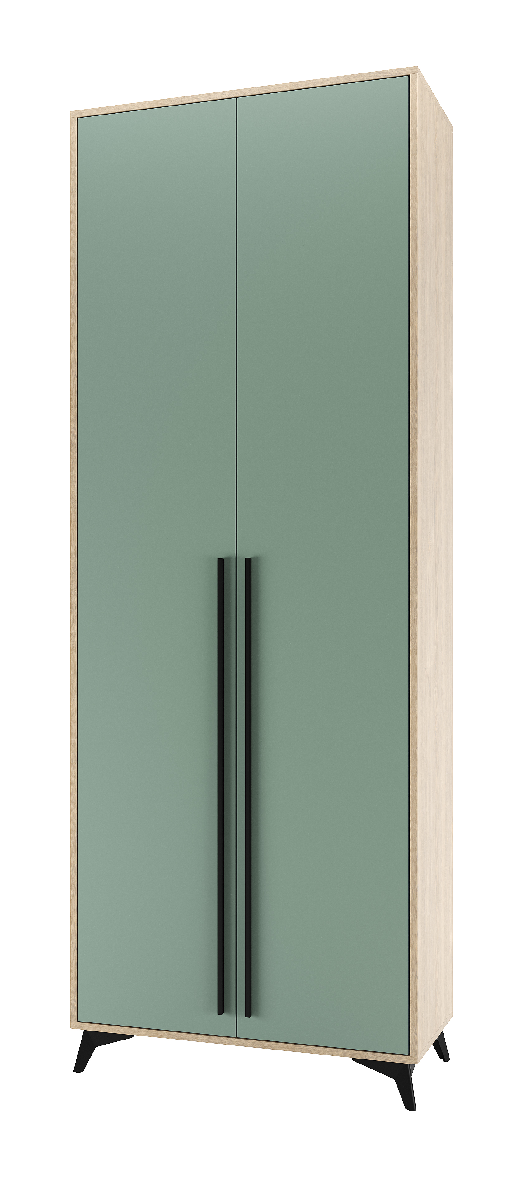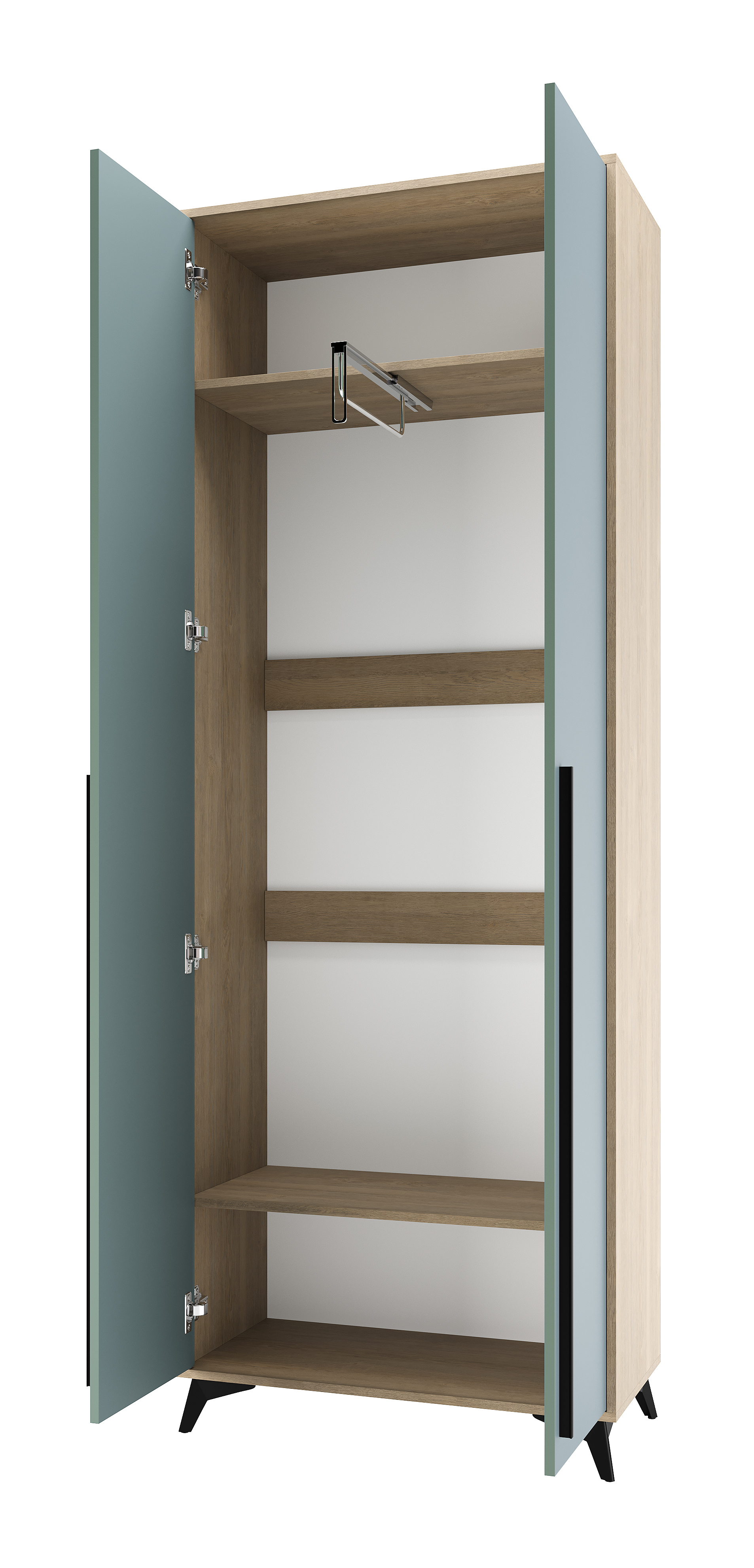 Шкаф 800 2С «ЕВА» с выдвижной металлической штангой. Фасады и лицевой периметр шкафа обработаны кромкой 1 мм. Чёрные металлические ручки-рейлинги и ножки-опоры.