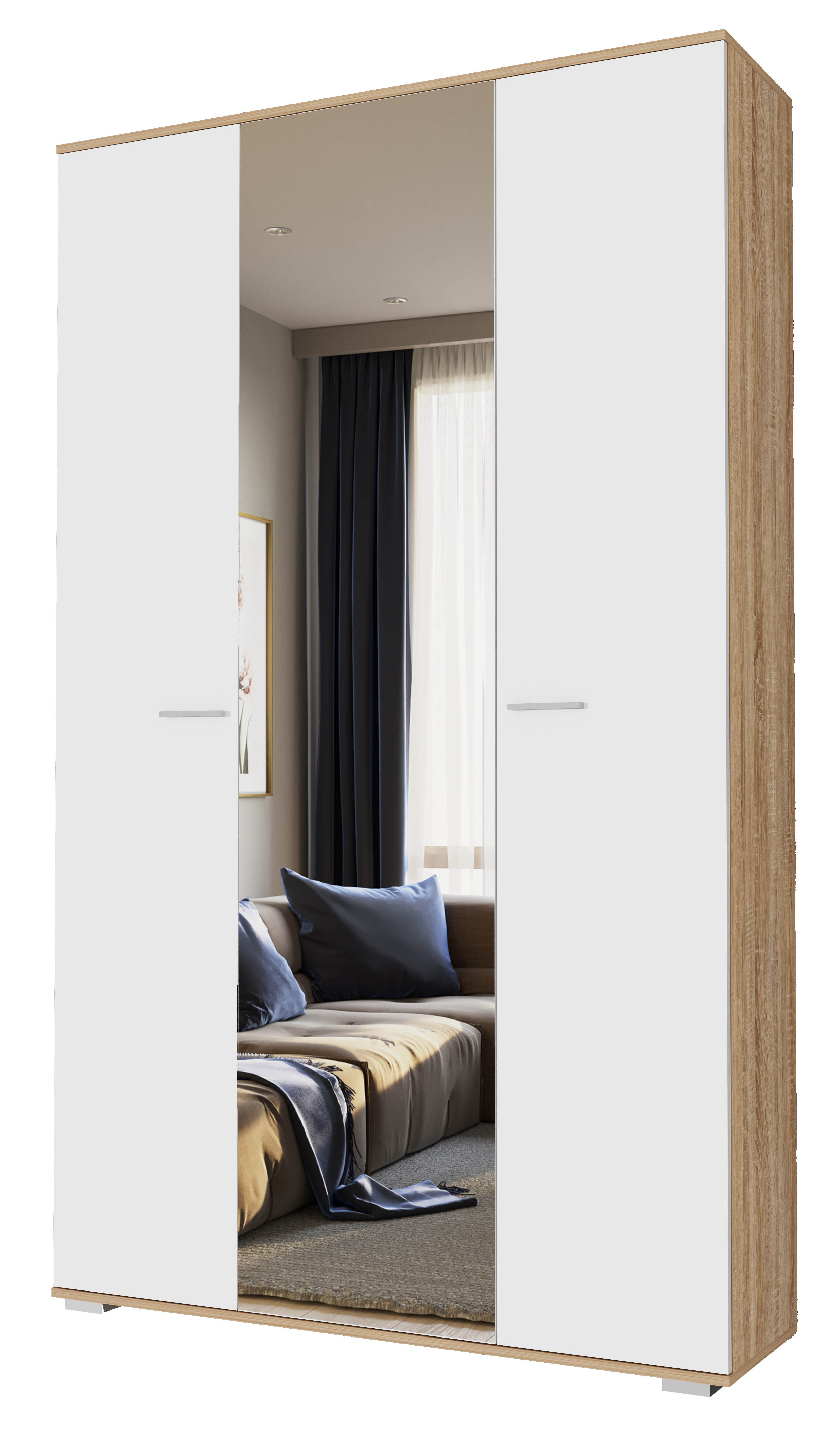 Шкаф с зеркалом «ИТАЛИЯ» ШК-1300 трёхстворчатый, с полками и 2-мя выдвижными штангами для верхней одежды. Обработка зеркала «фацет» по периметру.