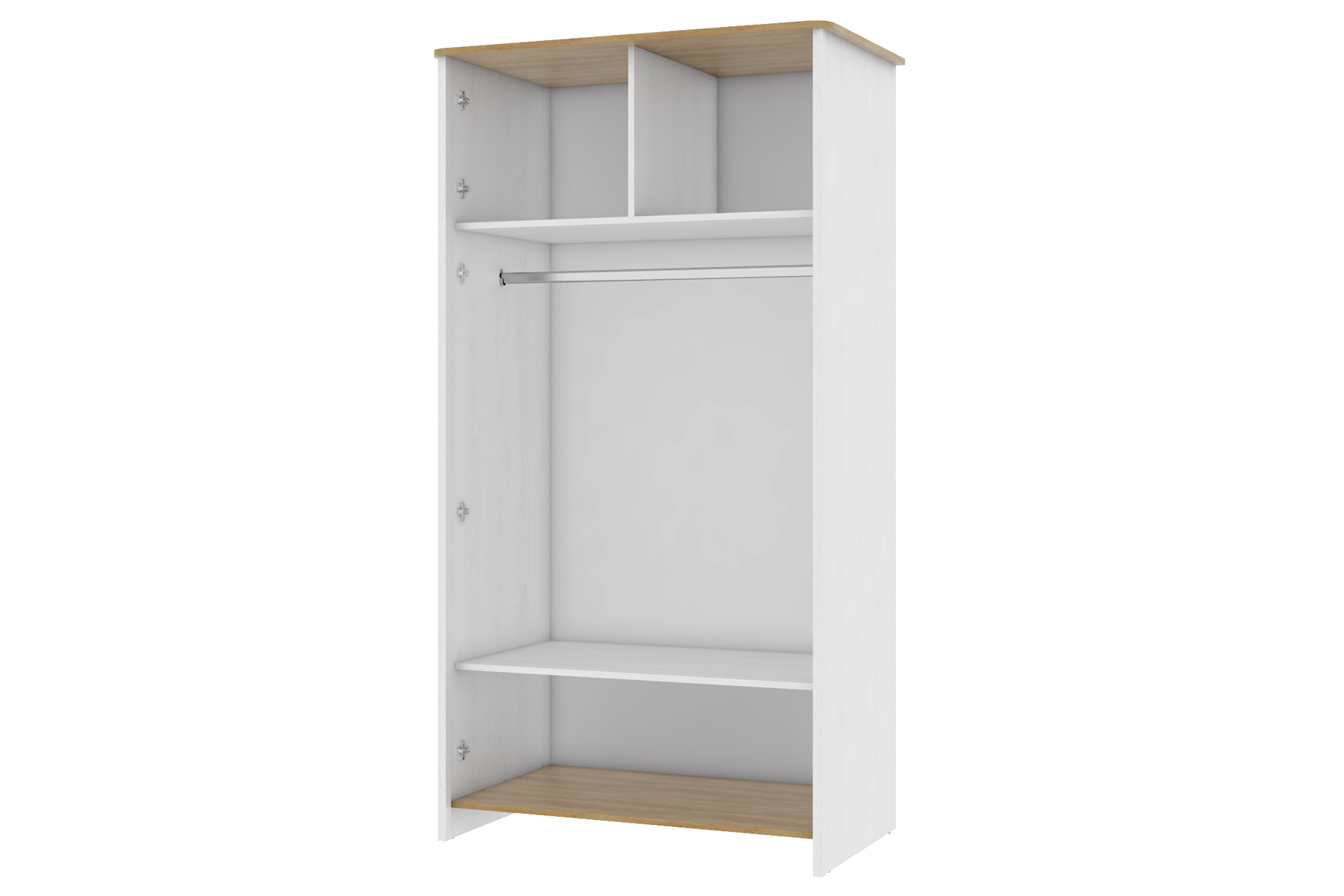 Фасады изготовлены из МДФ в оттенке «Белая сосна» — светлом и тёплом, с эффектом мягкой древесной текстуры. Корпус выполнен из КДСП и ЛДСП, сочетая в себе контраст «Дуб небраска» и той же «Белой сосны», что придаёт шкафу мягкий характер и стильную глубину.
