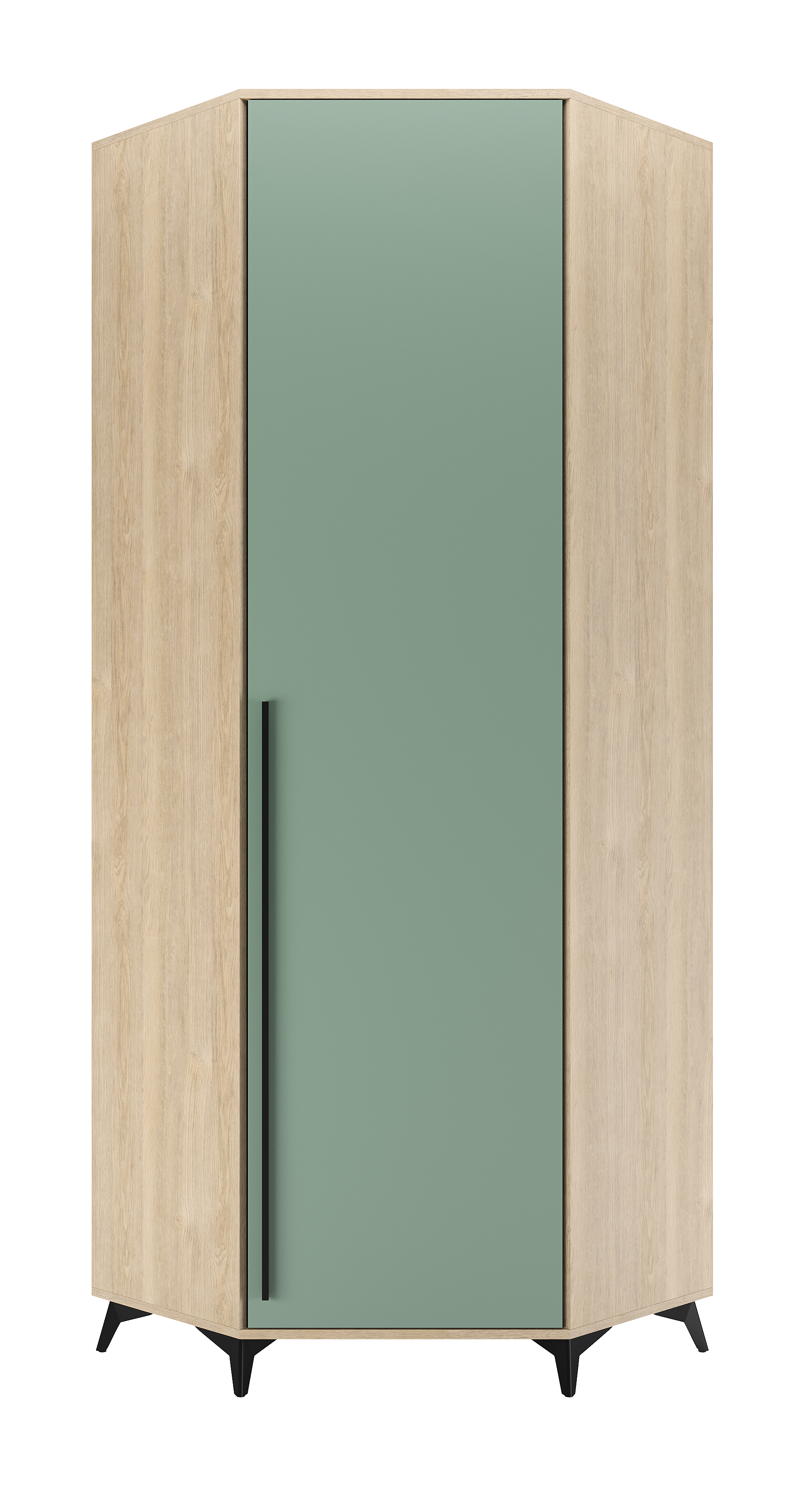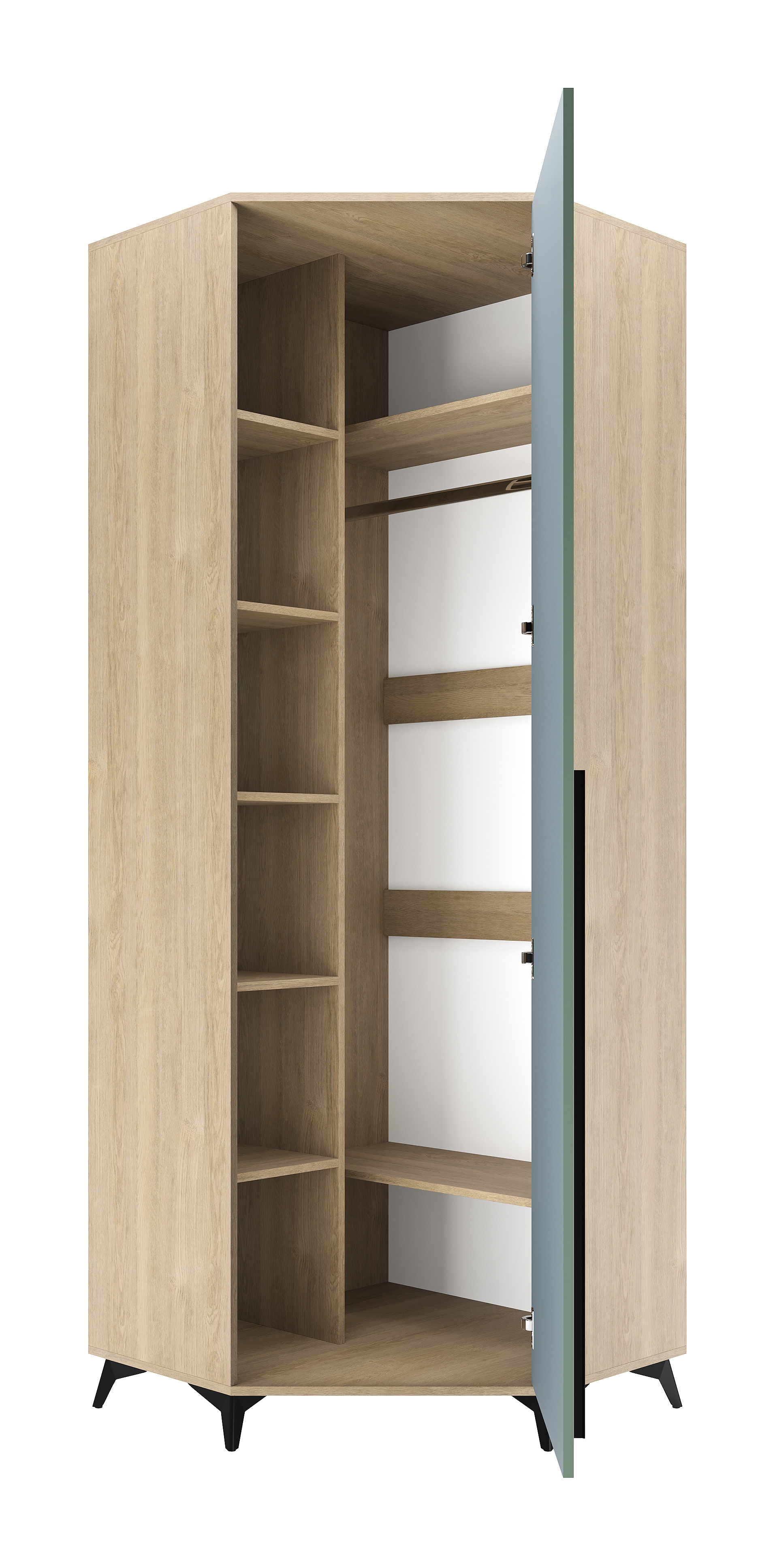 Шкаф угловой 800 1С «ЕВА» с поперечной металлической штангой, с полками. Фасад и лицевой периметр шкафа обработаны кромкой 1 мм. Чёрная металлическая ручка-рейлинг и ножки-опоры.