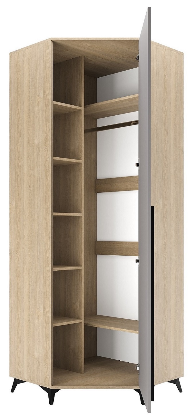 Шкаф угловой 800 1С «ЕВА» с поперечной металлической штангой, с полками. Фасад и лицевой периметр шкафа обработаны кромкой 1 мм. Чёрная металлическая ручка-рейлинг и ножки-опоры.