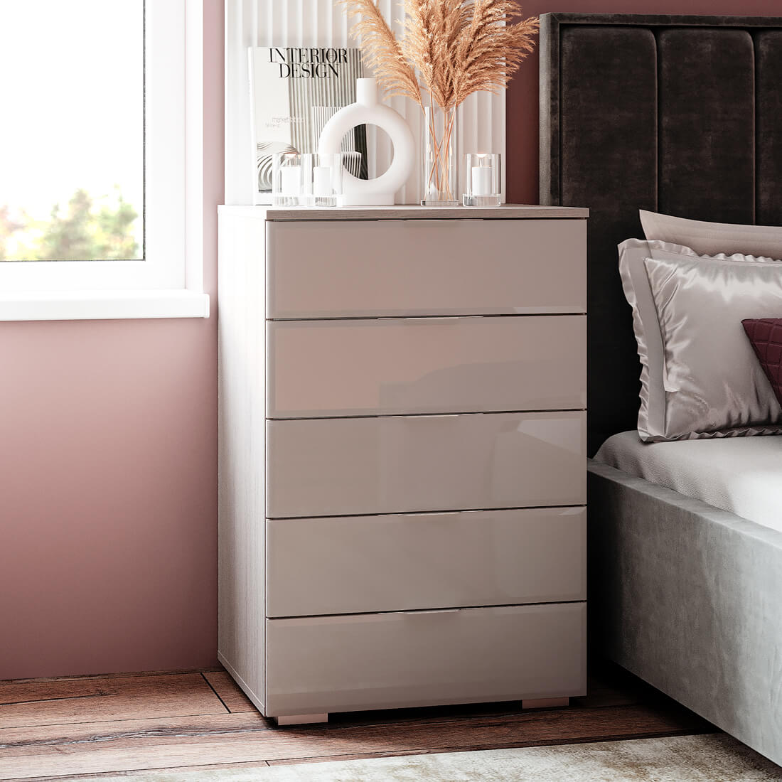 Комод «Алекса» - удобная система хранения для одежды, постельных принадлежностей или других хозяйственных аксессуаров, которая состоит из пяти вместительных выдвижных ящиков на шариковых направляющих, обеспечивающих лёгкую и бесшумную эксплуатацию модели.