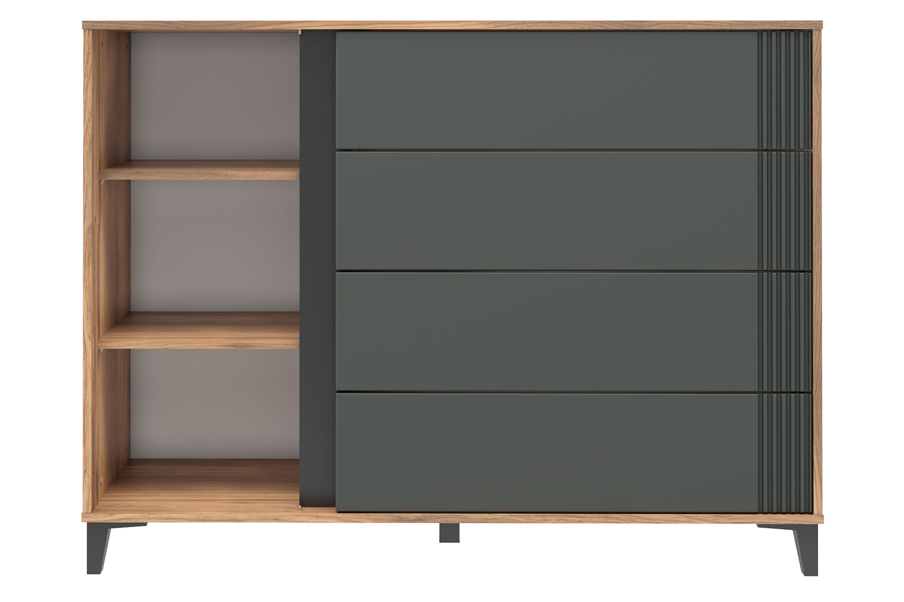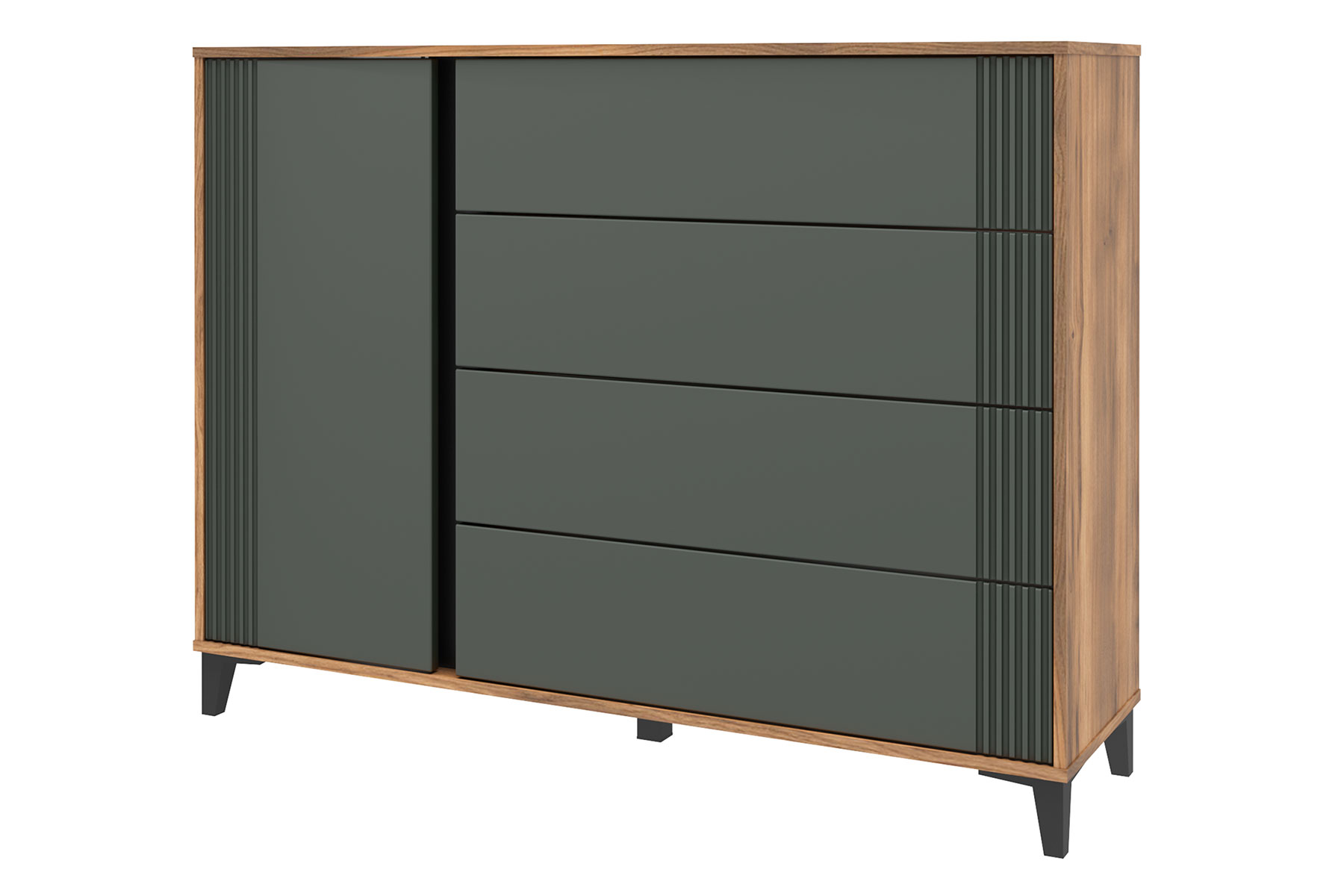 Комод «Богемия» изготовлен из высококачественных материалов. Корпус изготовлен из ламинированной древесностружечной плиты толщиной 16мм. Фасады выполнены из МДФ толщиной 19мм и покрыты пленками ПВХ с эффектом Soft touch. Это обеспечивает не только стильный внешний вид, но и приятные тактильные ощущения.