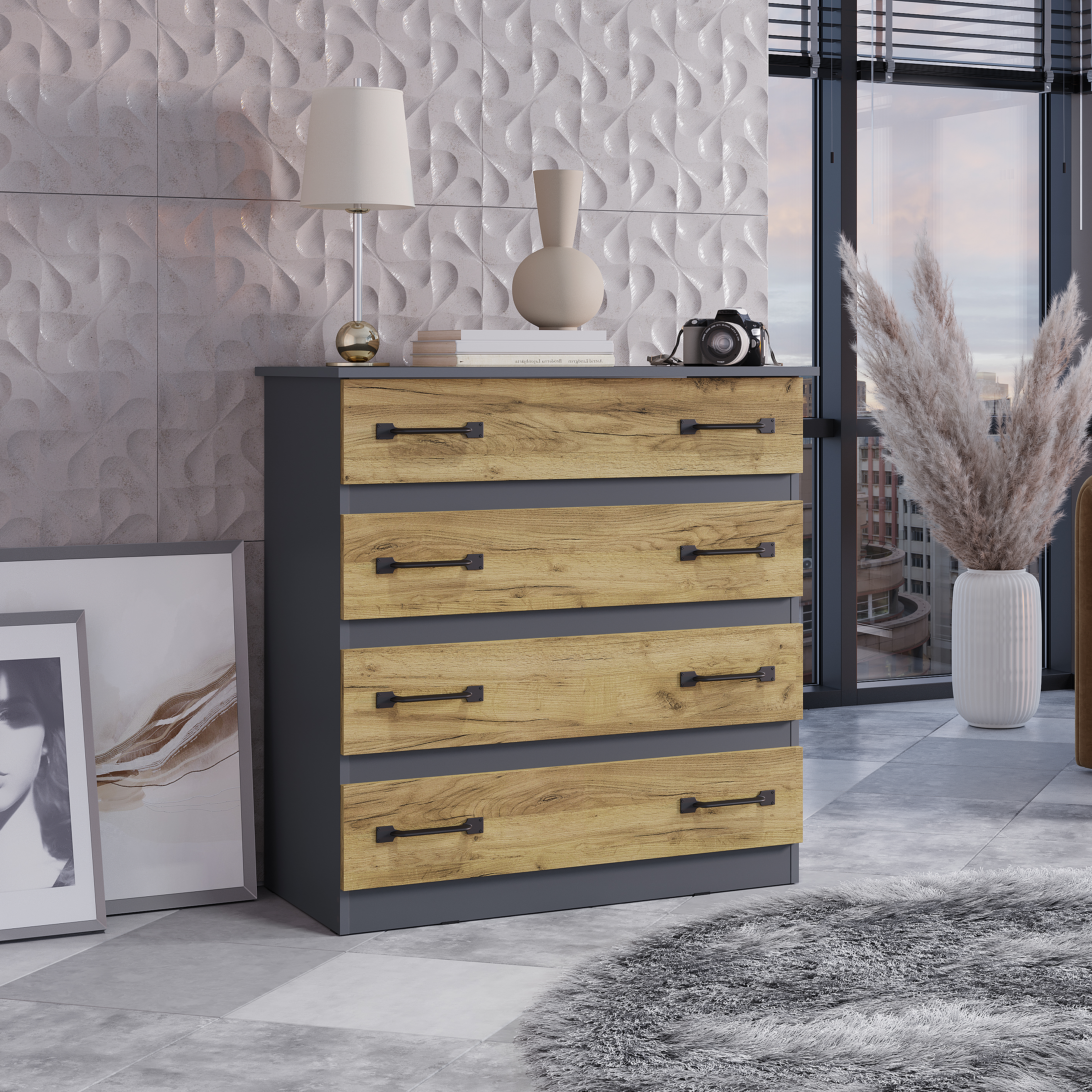 Комод «Лофт» — вместительный комод с четырьмя вместительными ящиками — универсальное решение, которое подойдёт и для спальни, и для домашнего кабинета, и для гостиной. Данная модель идеально подходит для хранения белья, одежды, аксессуаров, важных документов, украшений и мелочей. Верхнюю крышку можно использовать как дополнительную полочку для лампы.