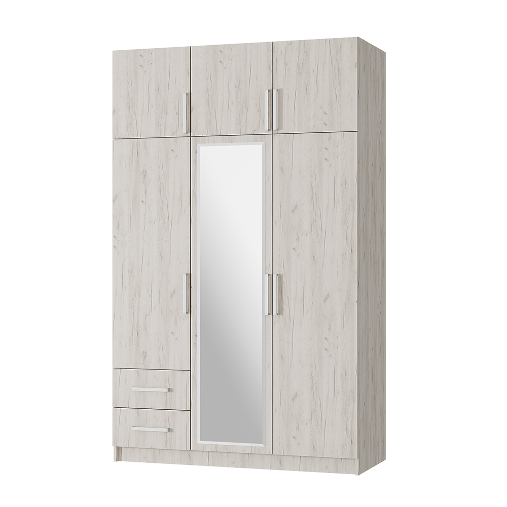 Очень вместительная модель трехстворчатого шкафа с ящиками будет прекрасно смотреться в вашей спальне. Изделие состоит из нескольких зон для хранения одежды и обуви, включая два выдвижных ящика для мелких вещей, отделение для одежды на вешалках и вместительные полки. В центральную створку вставлено зеркало, что помимо основной функции, позволяет визуально расширить пространство.