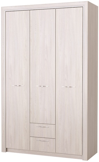 Шкаф 3С2Я «Октава» 3-створчатый с зеркалом и ящиками, с полками для белья и поперечной металлической штангой для верхней одежды. Устанавливается стильная металлическая ручка, декор «тёмный никель». Периметр шкафа обрамлён профилем MDF оригинальной формы с патиной (окраской фасок) серебристого цвета. Направляющие шариковые, полного выдвижения.