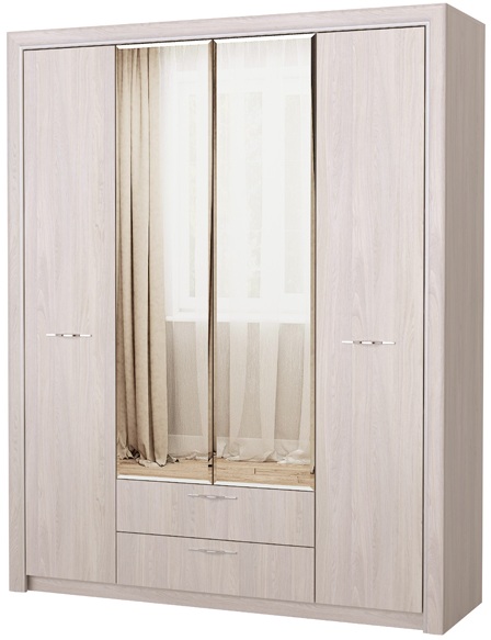Шкаф 4С2Я «Октава» 4-створчатый с зеркалами и ящиками, с полками для белья и поперечными металлическими штангами для одежды. Устанавливается стильная металлическая ручка, декор «тёмный никель». Периметр шкафа обрамлён профилем MDF оригинальной формы с патиной (окраской фасок) серебристого цвета. Направляющие шариковые, полного выдвижения. Зеркала выполнены с изящной и красивой обработкой «фацет» по периметру.