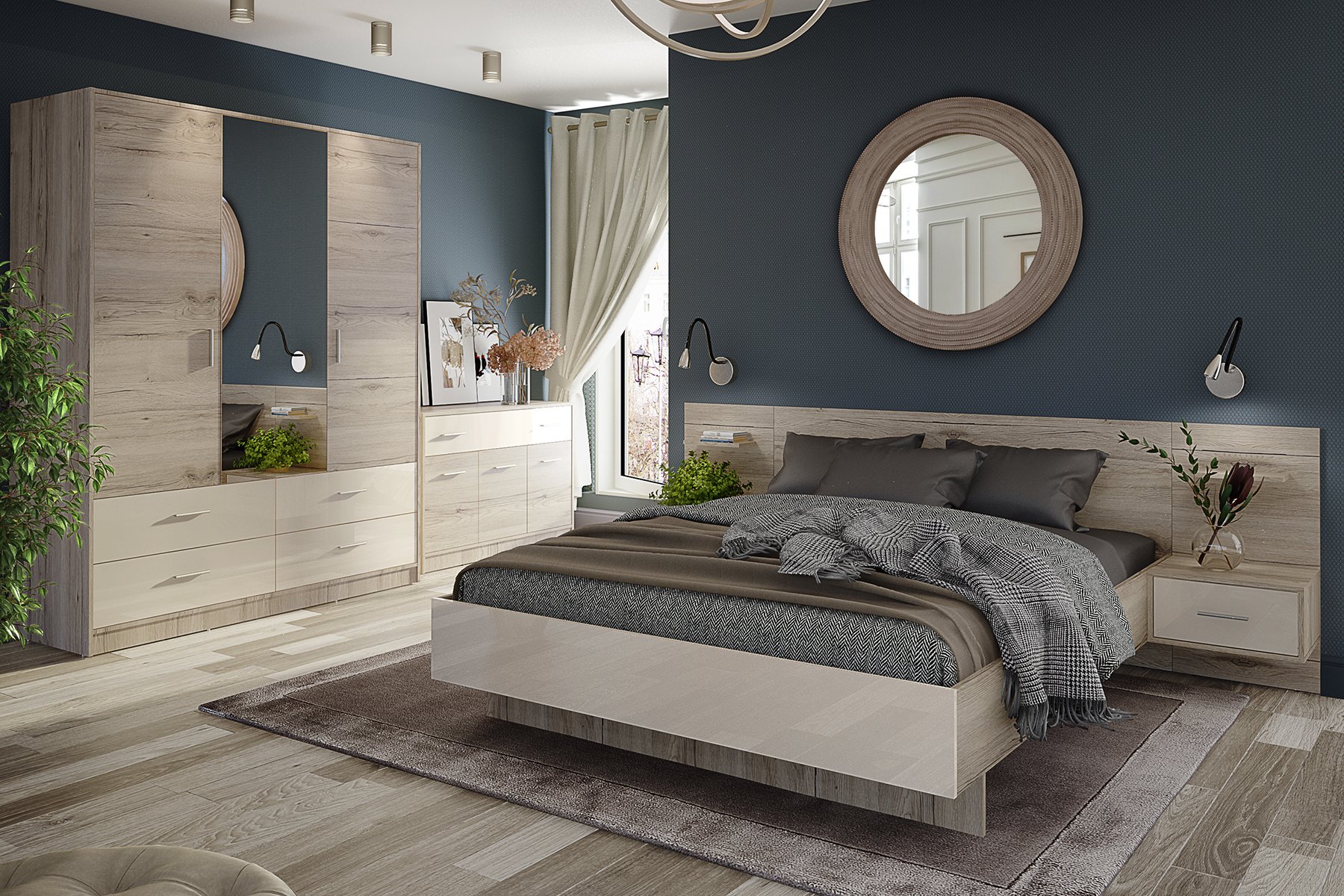 Корпус спальни изготовлен из 16 мм ламинированной древесностружечной плиты цвет –«Дуб Санремо» и «Крем Бежевый». Торцевые поверхности корпуса закромлены кромками ПВХ и ABS. Фасады изготовлены из 16 мм ламинированной древесностружечной плиты цвет –«Дуб Санремо» и «Крем Бежевый». По периметру фасады закромлены кромками ПВХ и ABS. Детали, изготовленные из древесностружечной плиты цвет – «Крем Бежевый», обработаны на лаконаливных машинах имеют высоко глянцевую поверхность .