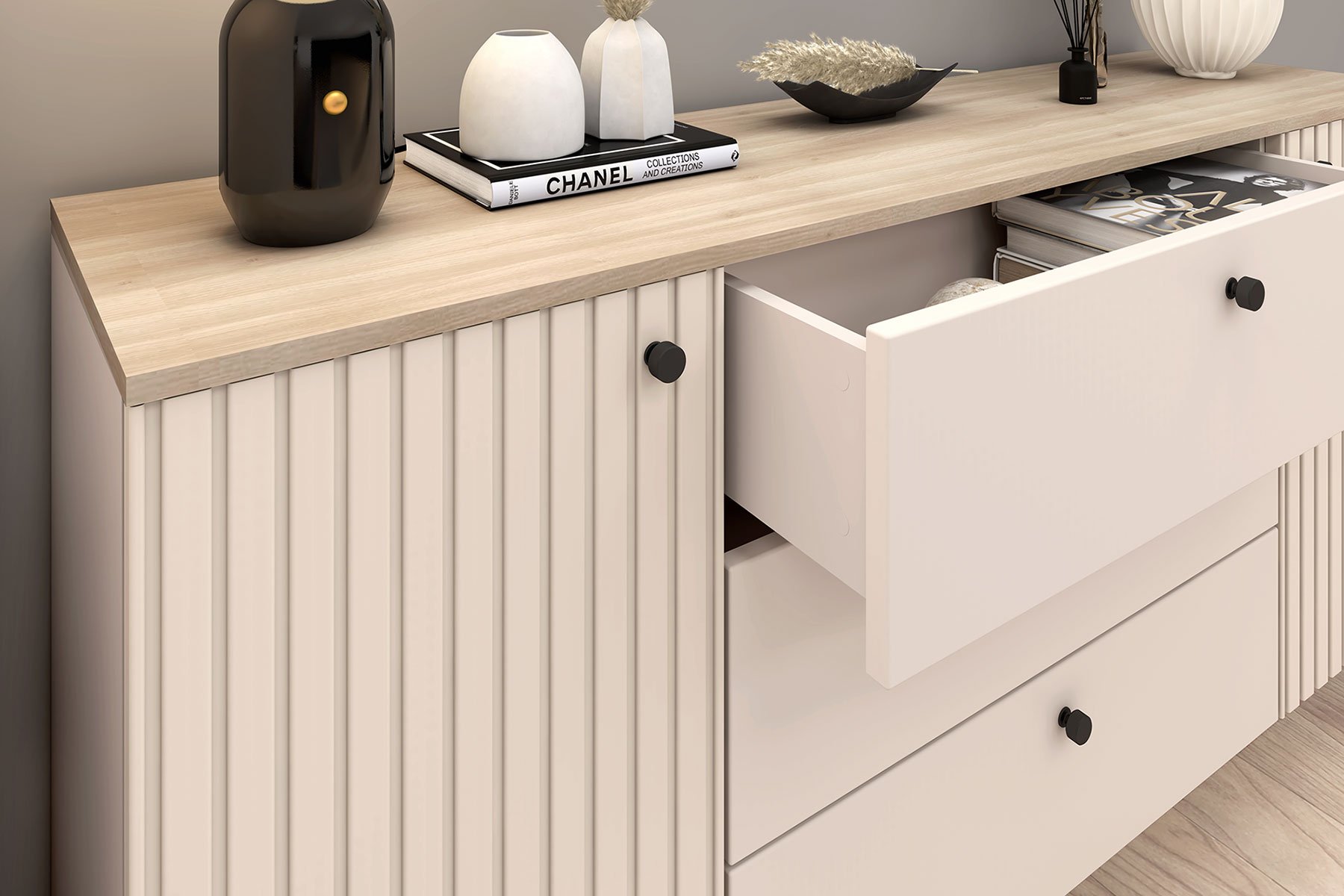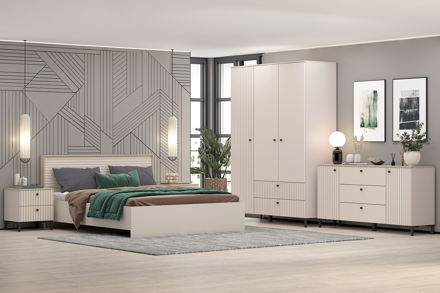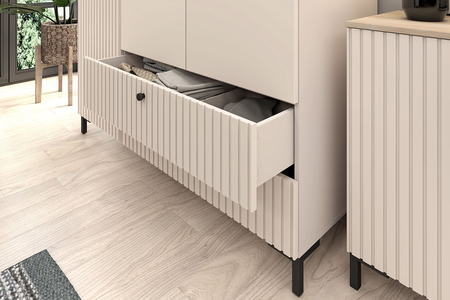 корпуса закромлены кромками ПВХ и ABS. Фасады изготовлены из 19 мм МДФ плиты цвет, укрытой пленкой ПВХ с эффектом Soft Touch.