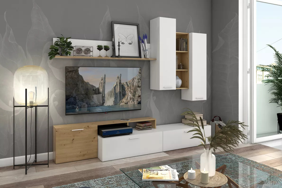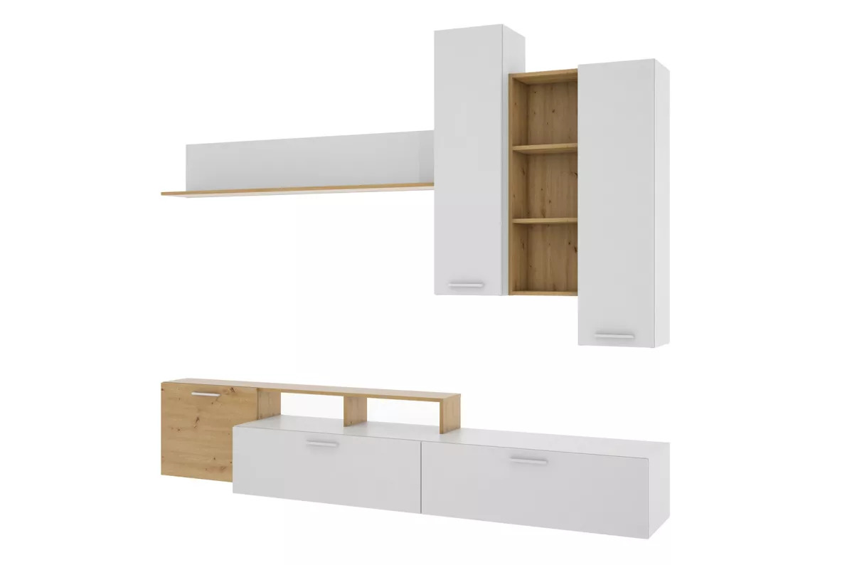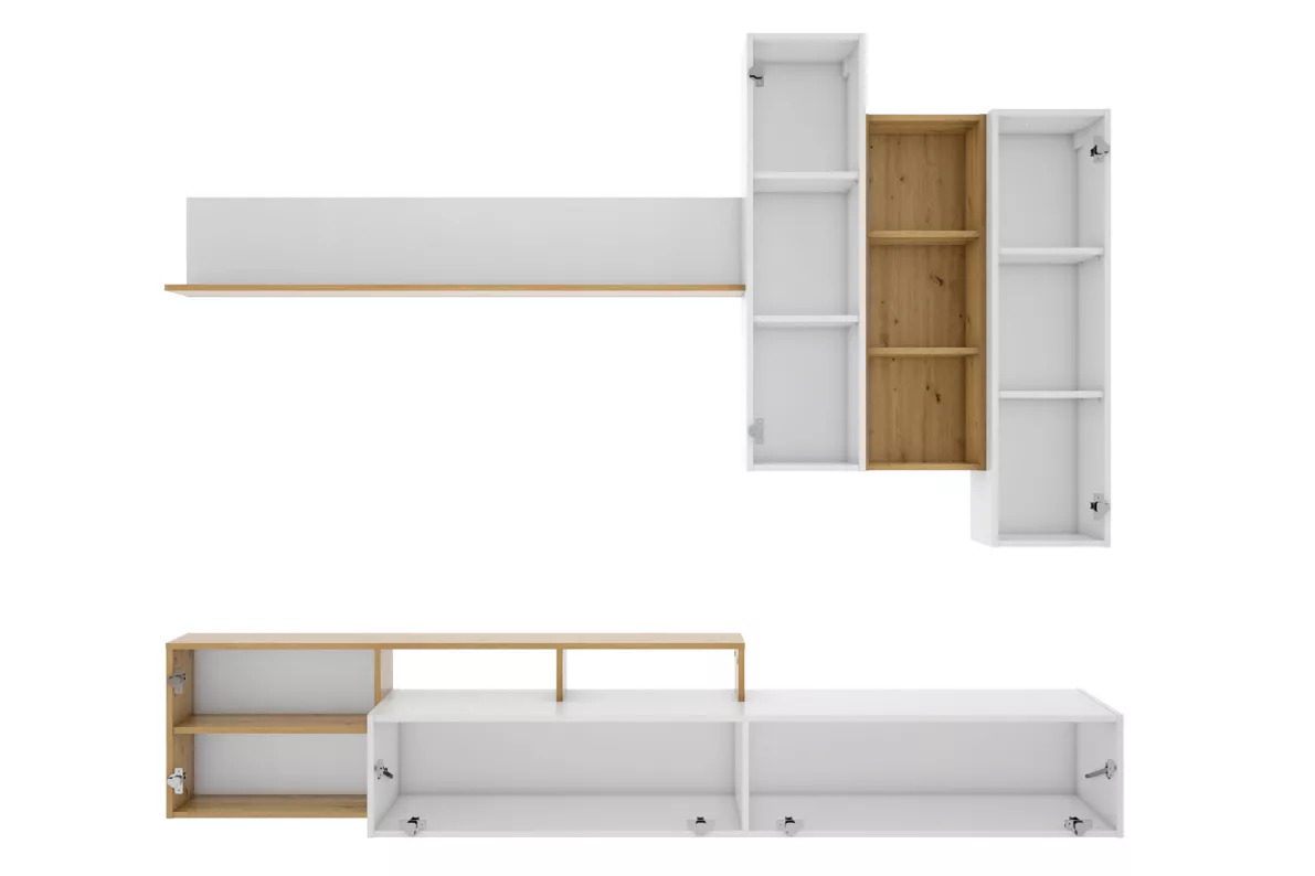 Корпус гостинной изготовлен из 16 мм ламинированной древесностружечной плиты - цвет «Белый»и «Дуб Дикий». Видимые и невидимые части каркасов закромлены кромками полепропилен и ABS. Фасады изготовлены из 16 мм ламинированной древесностружечной плиты - цвет «Белый» и цвет «Дуб Дикий». По периметру фасады закромлены кромками полепропилен и ABS. - Петли четырехшарнирные. - Ручки пластиковые. - Навеска полок осуществляется на механизмы SCARPI. - Нижние фасады открываются с помощью барных механизмов.